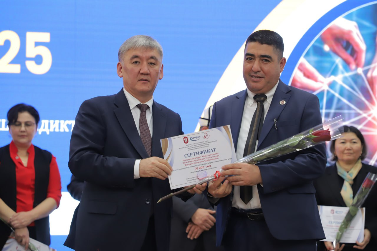 - «Өндүрүшкө багытталган мыкты долбоор-2025» номинациясы – Табият таануу, дене-тарбия, туризм жана агрардык технологиялар институтунун ветеринардык медицина жана биотехнология кафедрасынын профессору, айыл чарба илимдеринин доктору Абдугани Абдурасулов;