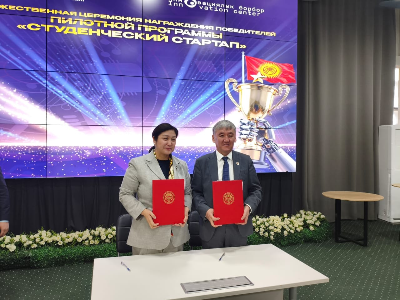 Жеңүүчүлөрдү сыйлоо жана келишимдерге кол коюу аземи 10-мартта «Инновациялык борбор» мамлекеттик мекемесинде өттү. Иш-чарага министр Гүлзат Исаматова, мекеменин директору Чыңгыз Жантаев, эксперттер, ошондой эле өлкөнүн жогорку окуу жайларынын ректорлору жана стартап-командалар катышты.