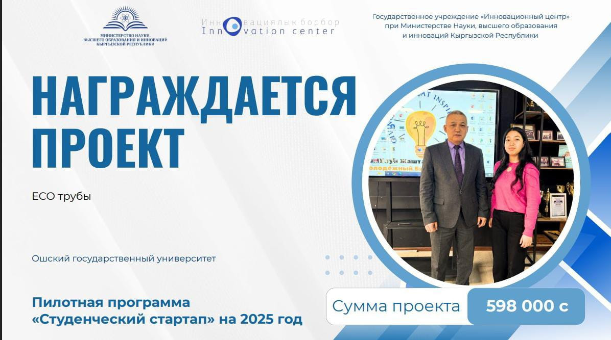 Ош мамлекеттик университетинин студенттери жаштар ишкерчилигин колдоого багытталган «Студенттик стартап – 2025» республикалык конкурсунда жеңүүчү болду. Натыйжада алар стартап-долбоорлорун ишке ашырууга мамлекеттик гранттарды утуп алышты.