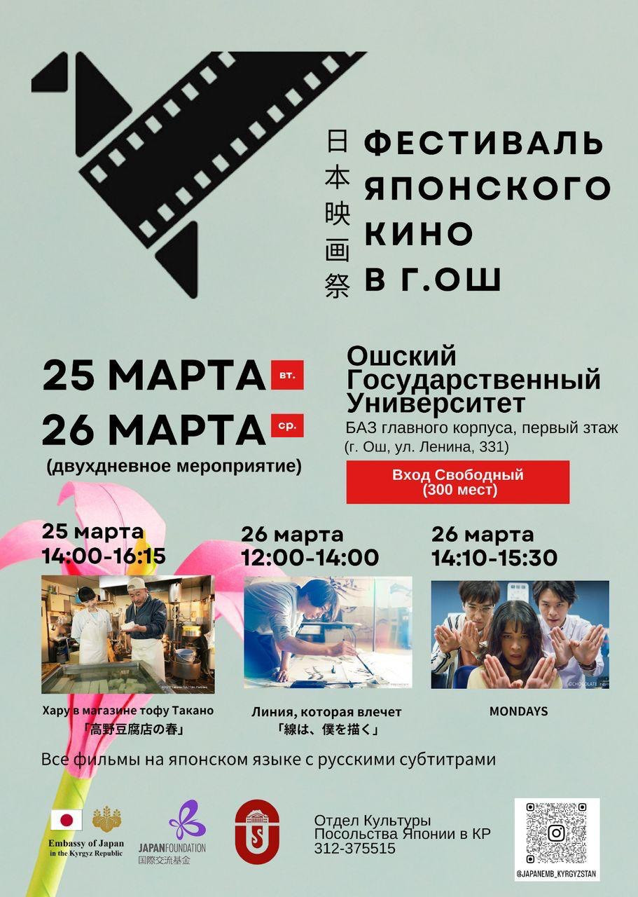 The Embassy of Japan in Kyrgyzstan, in collaboration with the Japan Foundation and Osh State University, will host the “Osh Japanese Film Festival” on March 25-26, 2025.
