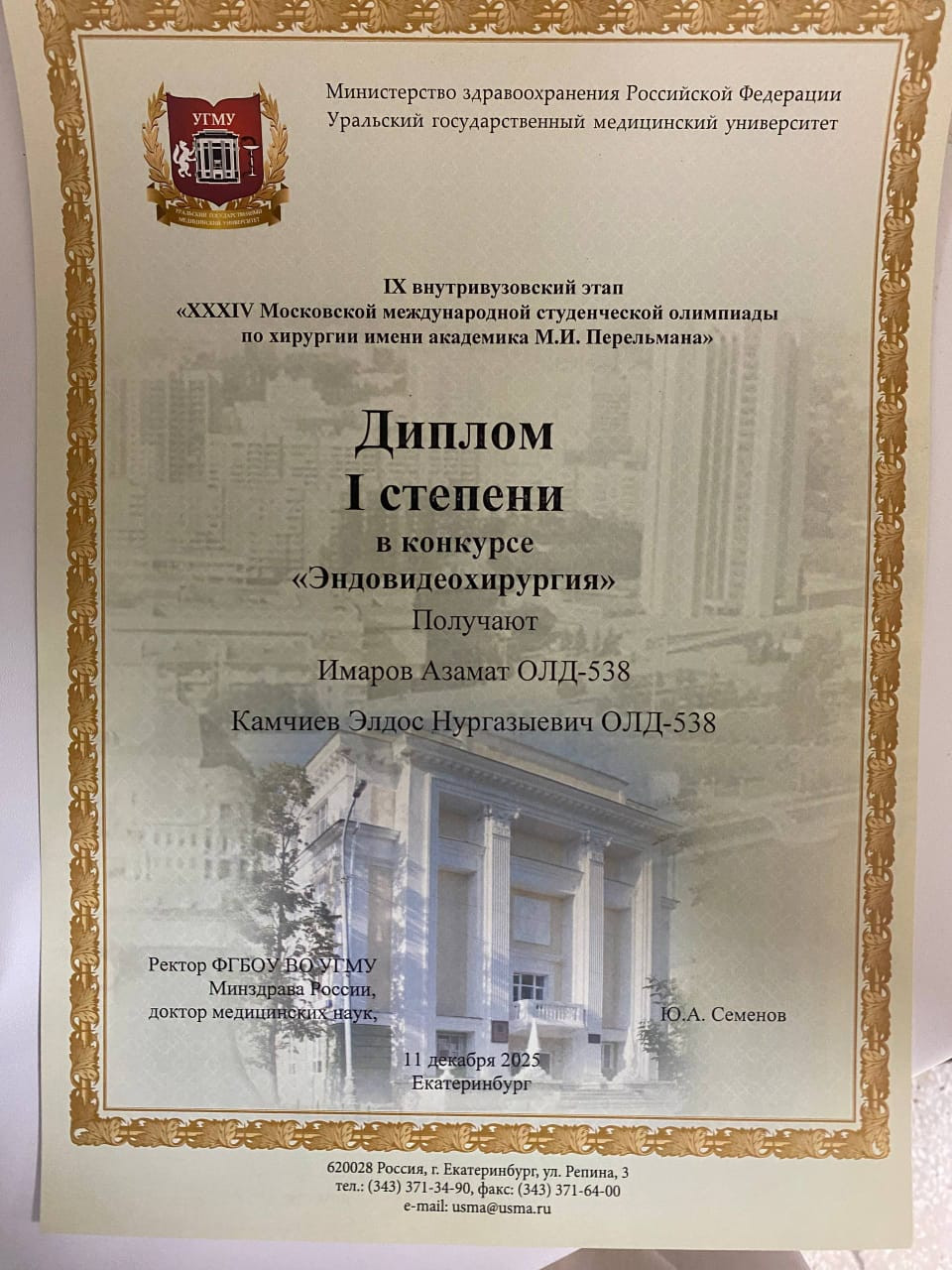 11 декабря в Екатеринбурге студенты 5-го курса медицинского факультета Азамат Имаров и Эльдос Камчиев заняли 1-е место в направлении эндовидеохирургии. Они продемонстрировали высокий уровень владения современными малоинвазивными хирургическими методами и подали пример профессиональной подготовки.