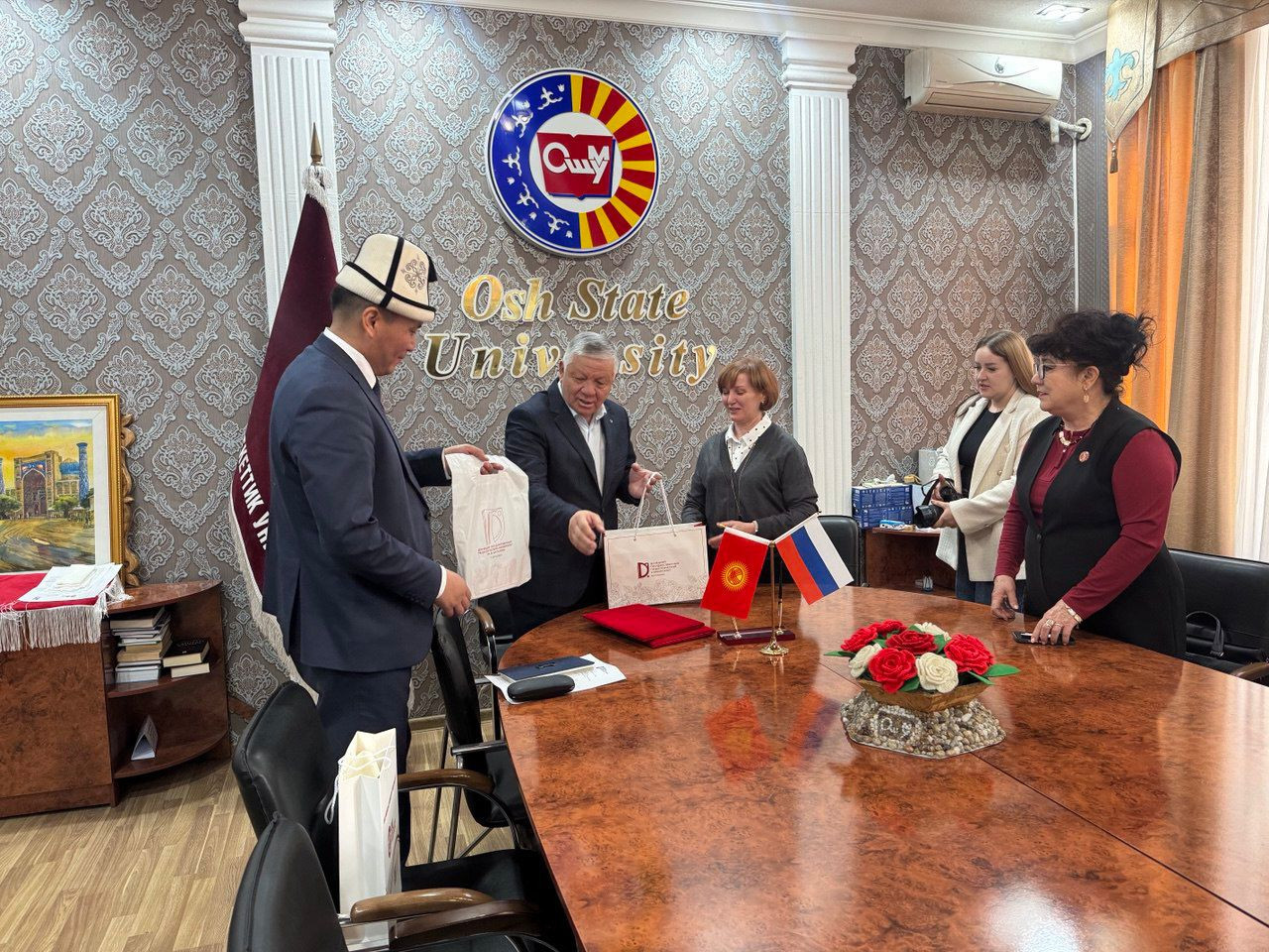 Сегодня, 5 февраля В ОшГУ состоялась встреча проректора по науке и инновациям Эльзара Эшарова и проректора по внешним связям Курсанта Аттокурова с представителями Донецкого государственного педагогического университета имени Шаталова (Россия).