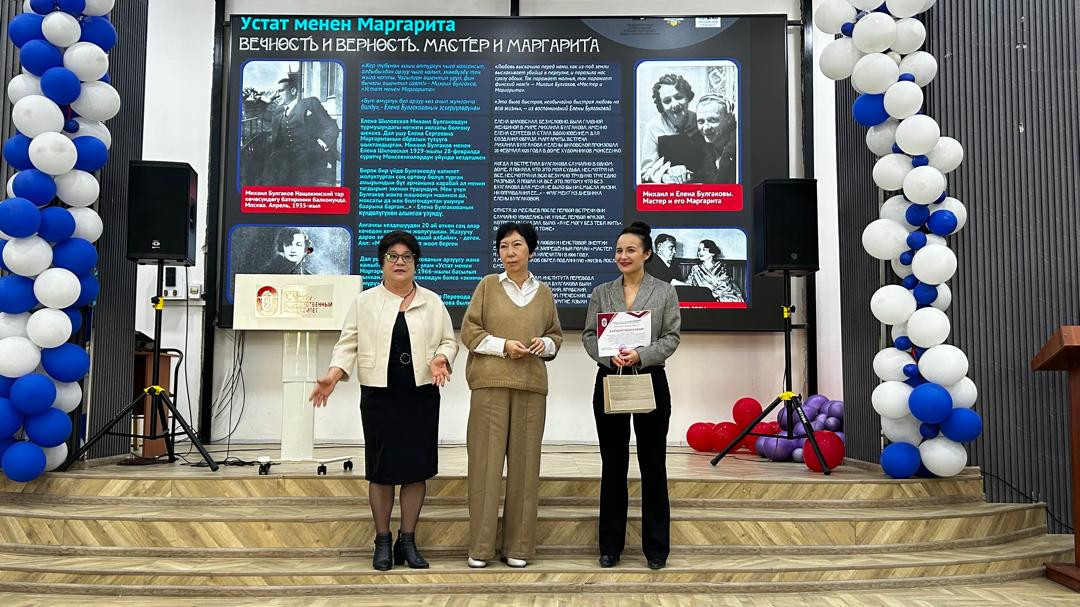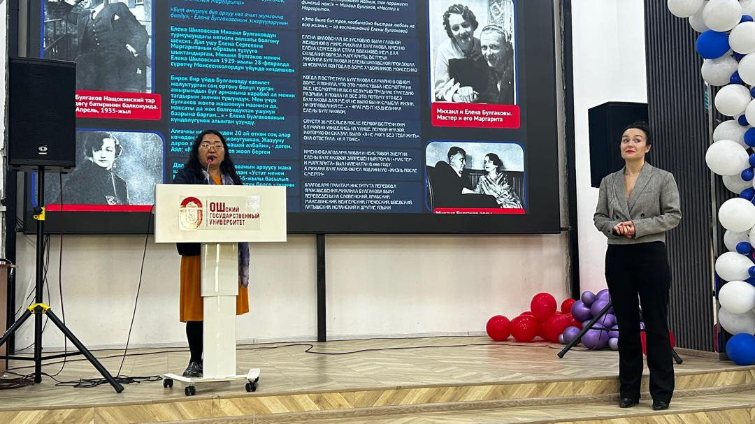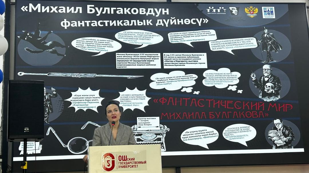 Лектор провела презентацию выставки «Фантастический мир Михаила Булгаков» выполненную параллельно на кыргызском и русском языках.