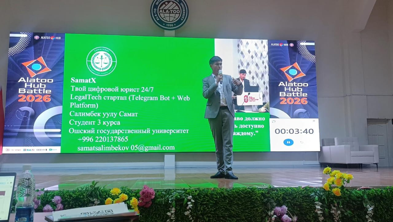 Alatoo Hub Battle 2026 öğrenci startup şampiyonası 8 Nisan’da Uluslararası Ala-Too Üniversitesi’nde düzenlendi. Şampiyonaya 100’den fazla proje katıldı ve en iyi 20 takım finale yükseldi.
