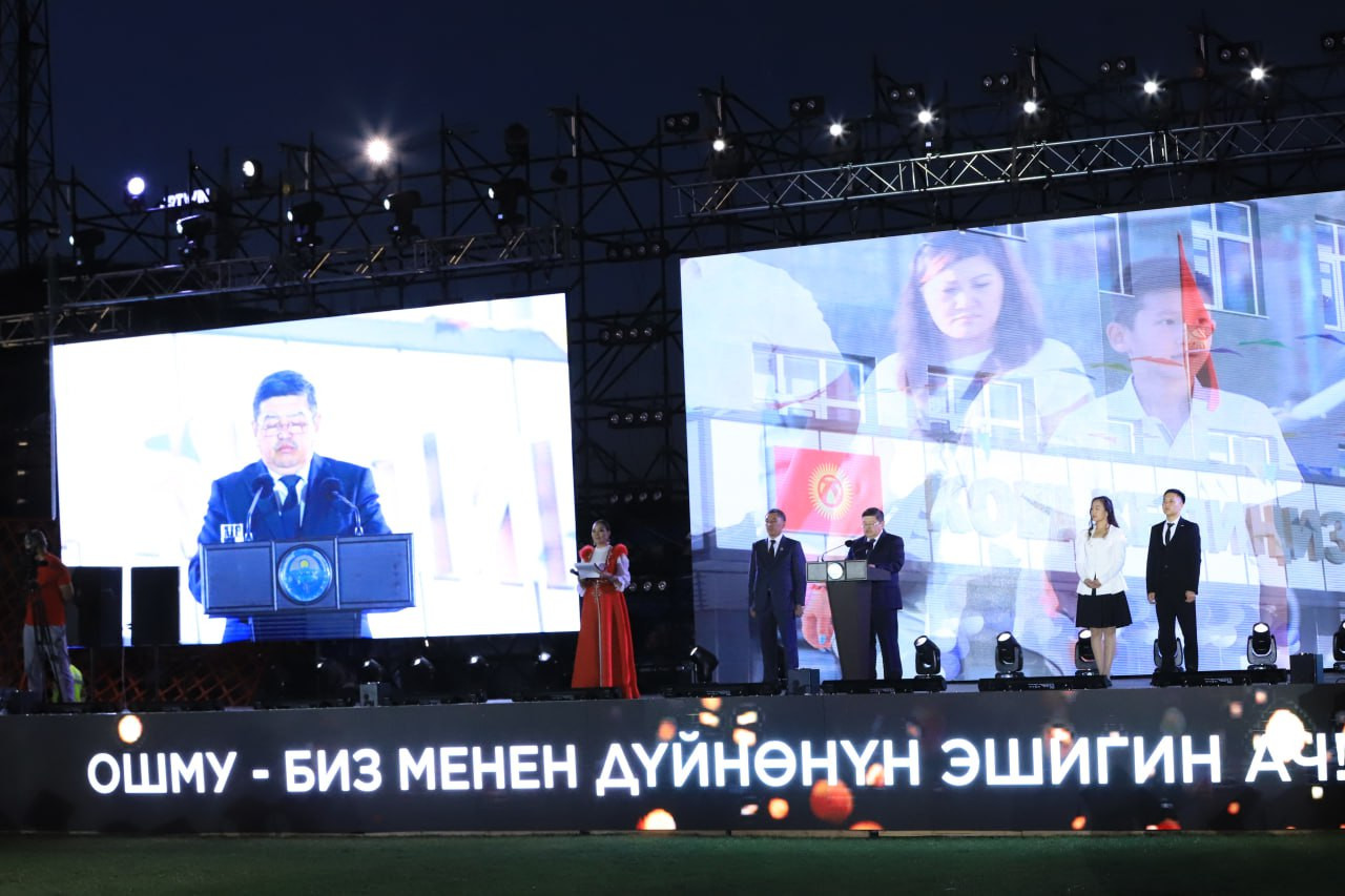 The 85th-anniversary celebration of Osh State University concluded with a grand show and concert at Suyunbaev Central Stadium. The President of Kyrgyzstan, Sadyr Japarov, conveyed his congratulatory message through the Chairman of the Cabinet of Ministers and Honorary Professor of Osh State University, Akylbek Japarov. The President’s message highlighted Osh State University’s leadership among national universities, noting its graduates’ significant contributions to public service, economics, and culture both domestically and internationally.