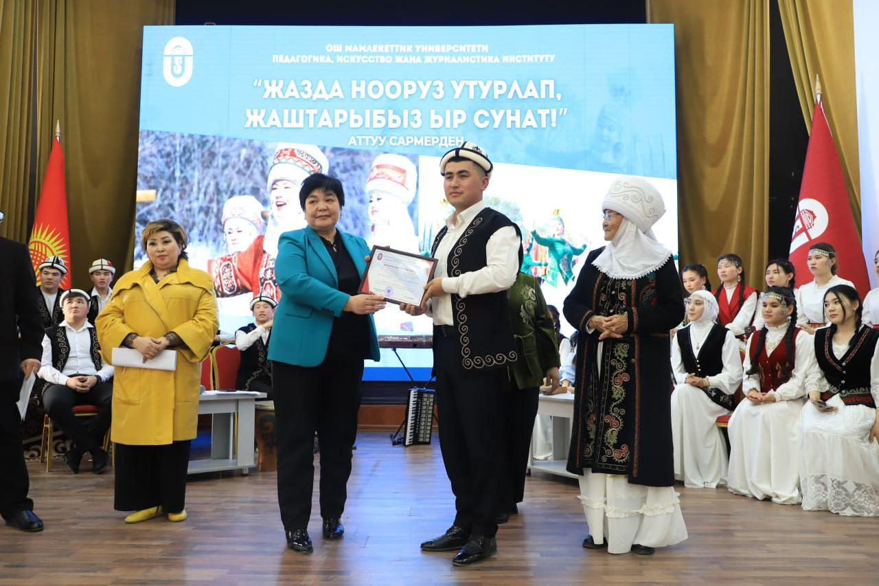 During the event, talented young men and women showcased their skills by singing, dancing, sharing proverbs and riddles, and performing excerpts from the Manas epic, creating an engaging spectacle. By the evening’s conclusion, the judging panel declared the girls’ team the winner. Vice-Rector for Social Work and Youth Policy of Osh State University, Nurzhamal Mapaeva, commended the students for their active participation and, along with the jury members, presented them with certificates of honor.