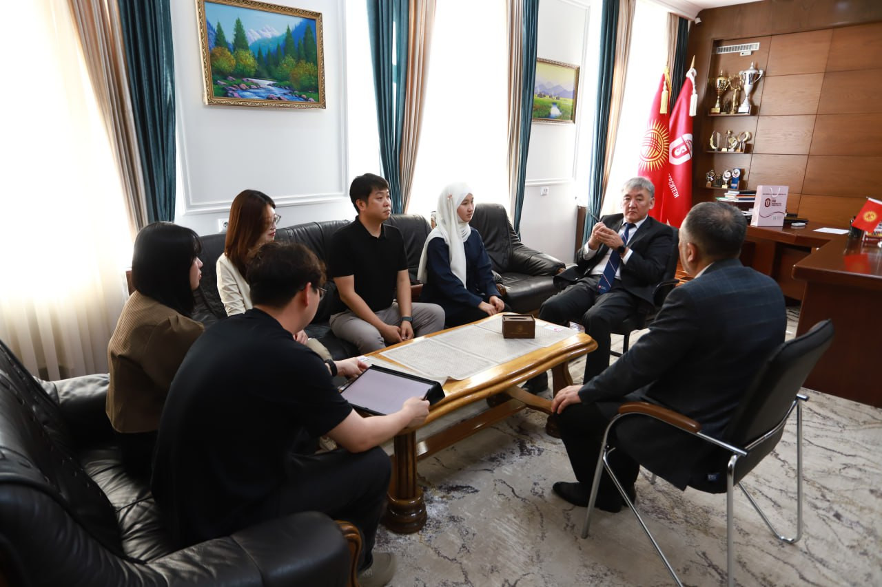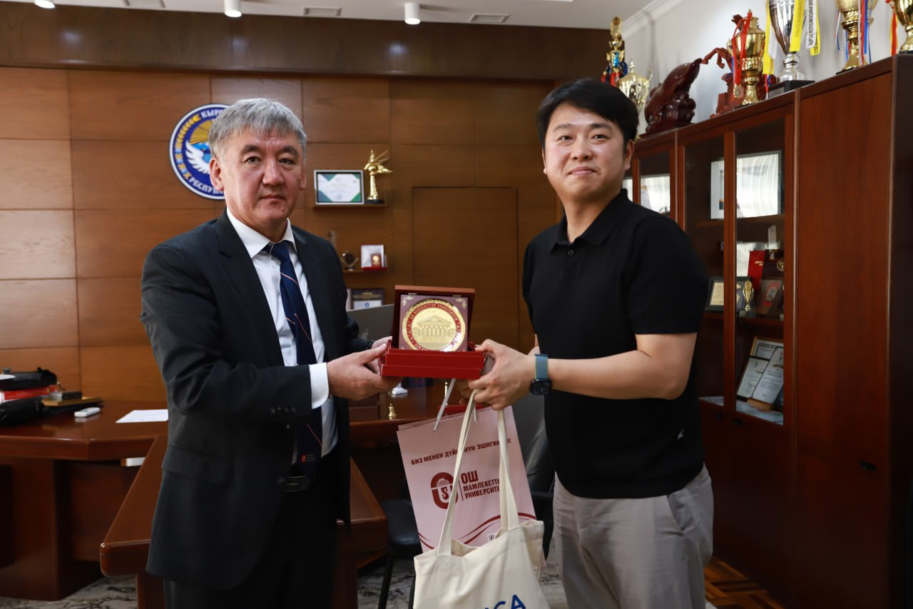 Кореянын Чонбук улуттук университетинин профессору Чой Сэнху баштаган делегация бүгүн, 4-июнда ОшМУнун ректору Кудайберди Кожобеков менен жолугуп, алдыдагы кызматташтыктар боюнча пикир алышты.