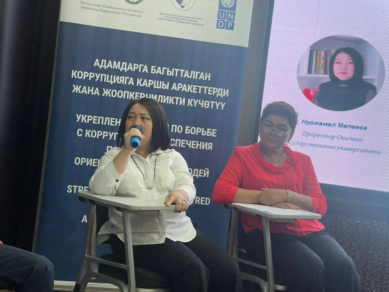 Иш-чарага мамлекеттик жана жергиликтүү өз алдынча башкаруу органдарынын, эксперттик, жарандык коомчулуктун, эл аралык уюмдардын, ошондой эле академиялык чөйрөлөрдүн өкүлдөрү катышты. ОшМУдан коомчулук менен иштөө жана жаштар саясаты боюнча проректор Нуржамал Мапаева катышып, Бириккен Улуттар Уюмунун Өнүктүрүү программасынын “Таза билим – таза коом” долбоорунун алкагында университетте жаштар арасында коррупцияга каршы жүргүзүп жаткан иштери боюнча маалымат берилди.