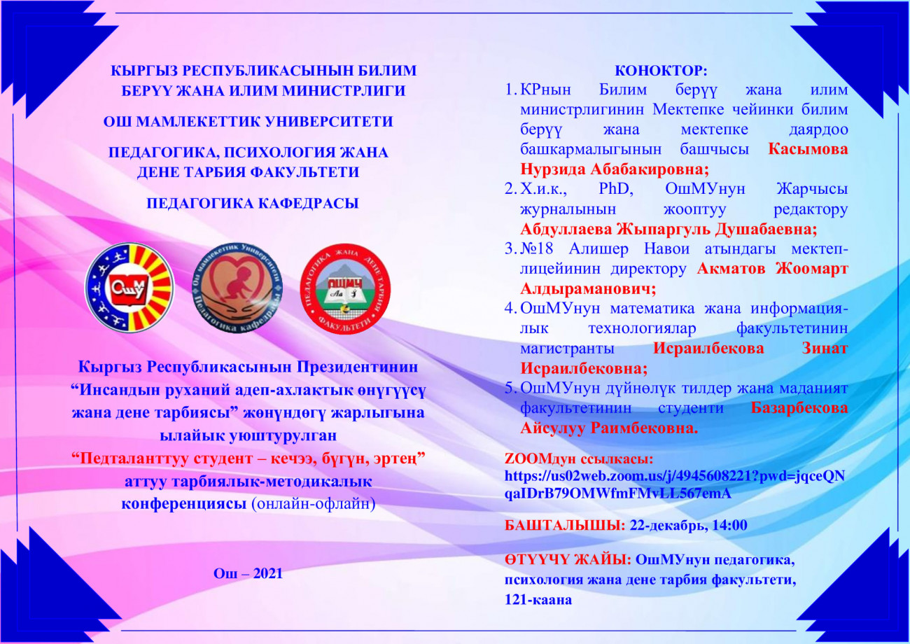 ОшМУнун педагогика, психология жана дене тарбия факультетинин педагогика кафедрасынын башчысы, доцент Гулмира Жутанова тарабынан 22-декабрда Президенттин «Инсандык руханий адеп-ахлактык өнүгүүсү жана дене тарбиясы жөнүндөгү жарлыгына ылайык “Педталанттуу студент – кечээ, бүгүн, эртең” деген аталыштагы тарбиялык-методикалык конференция уюштурулду.