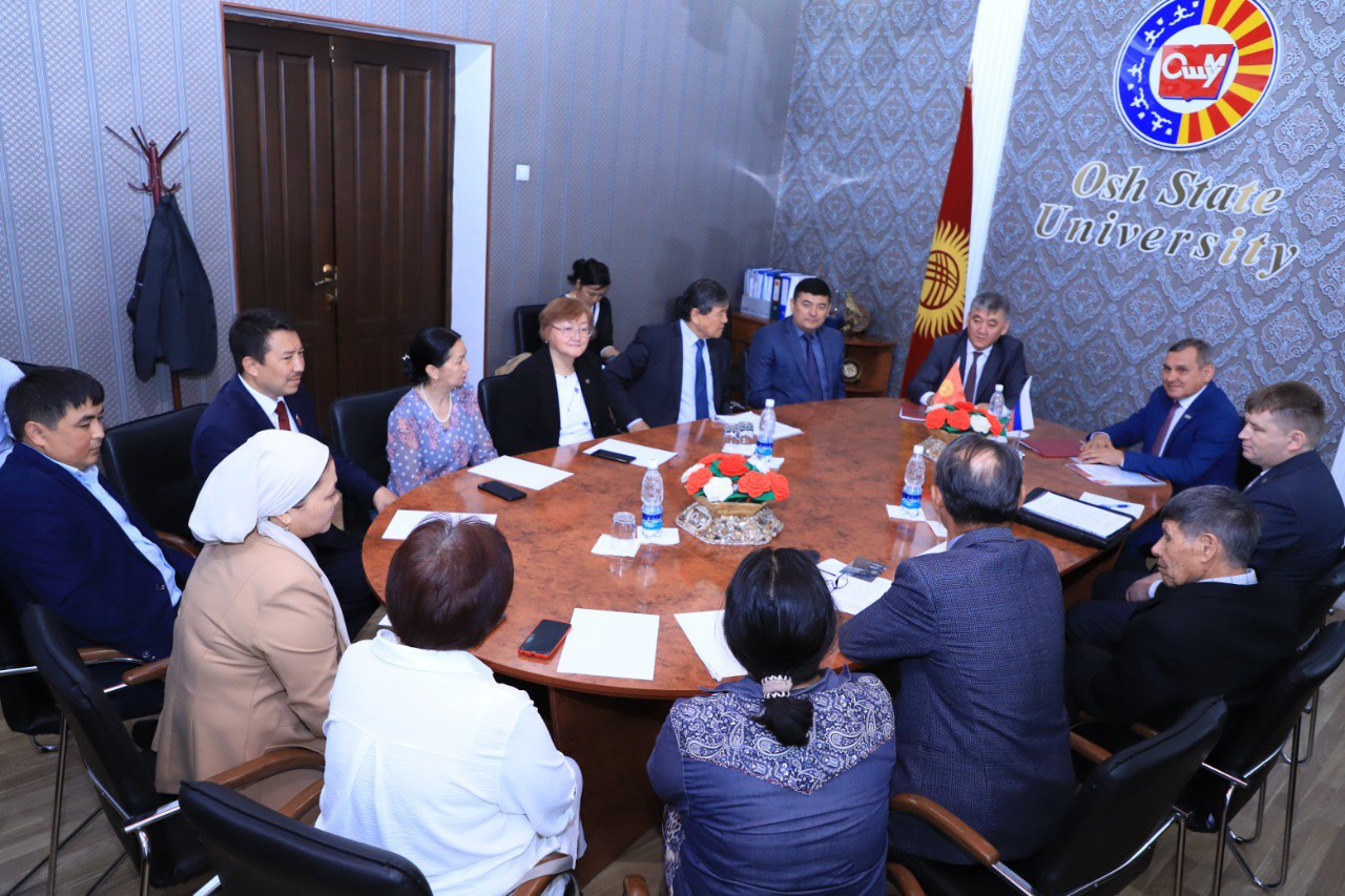 Делегация менен болгон жолугушууга ОшМУнун ректору Кудайберди Кожобеков, илимий иштер боюнча проректор Руслан Арапбаев, эл аралык байланыштар департаментинин директору Абдыганы Абдувалиев, Математика жана информациялык технологиялар факультетинин деканы У.Сопуев, Орус филологиясы факультетинин деканын окуу иштери боюнча орун басары Ы. Темиркулова, факультеттердеги кафедра башчылар жана программа жетекчилери катышты.