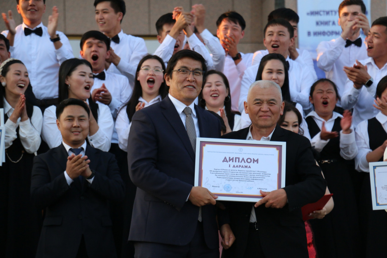 According to the festival-competition results, the choir from Osh State University’s Faculty of Arts Department of Performance on Folk Musical Instruments and Singing won first place, and the choir from the Faculty of Arts Department of Methods of Musical Education, Theory, and Choral Conducting came in third. The winning teams received diplomas and certificates for monetary prizes of 100,000 and 60,000 soms, respectively.