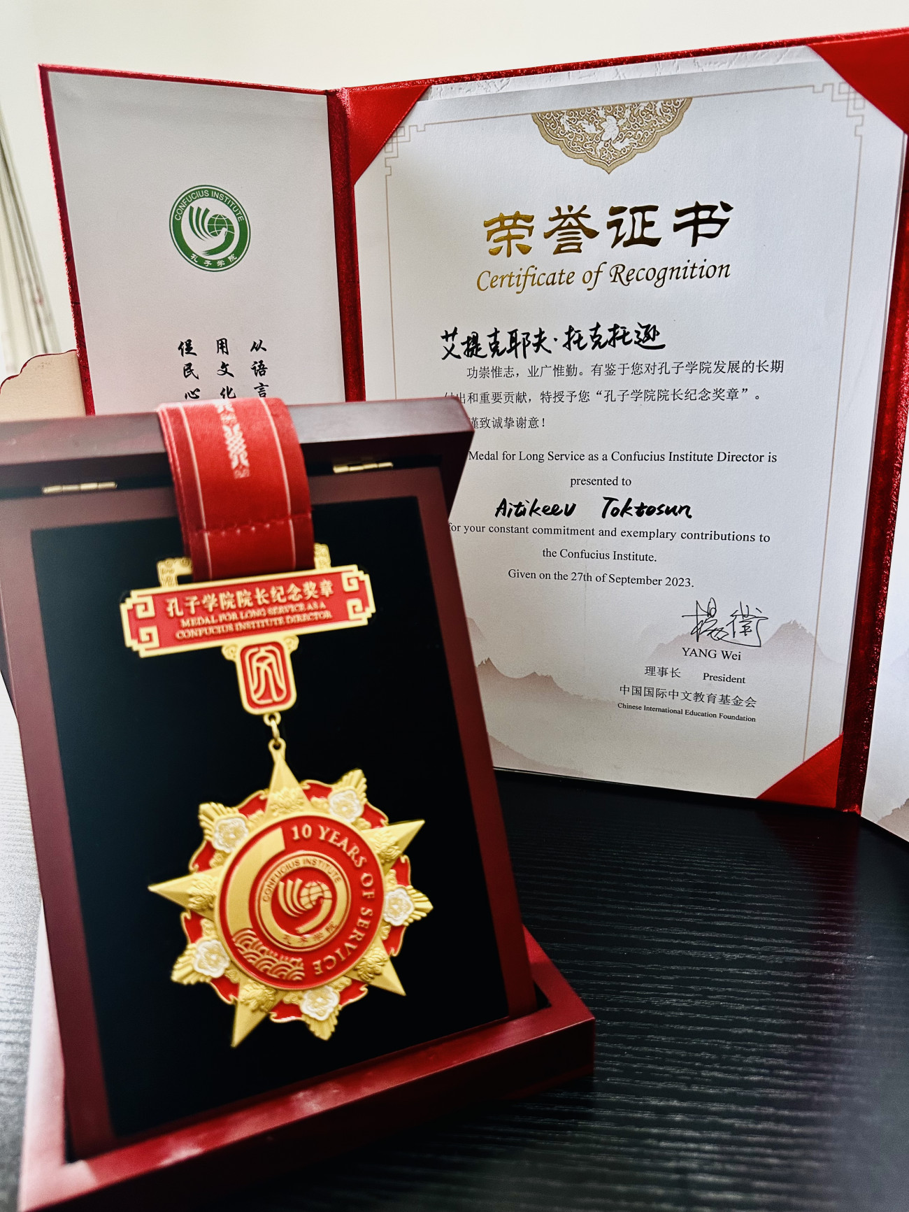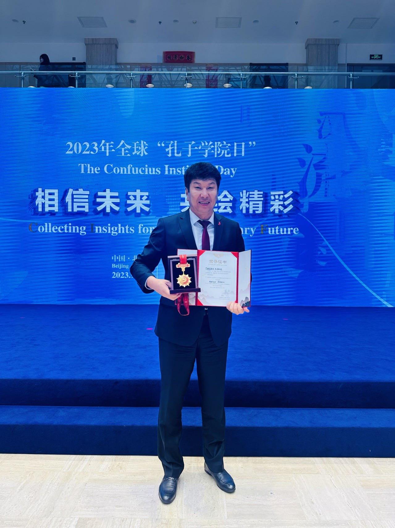 Toktosun Aitikeev, the dean of the Kyrgyz-Chinese Faculty at Osh State University, was awarded with the "10th Anniversary" medal by the Confucius Institute in Beijing.
