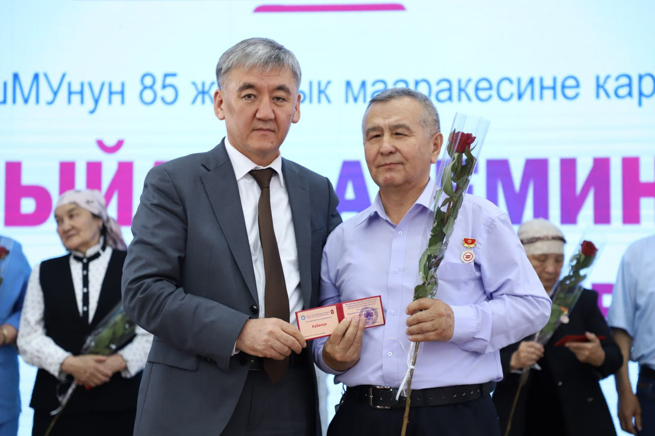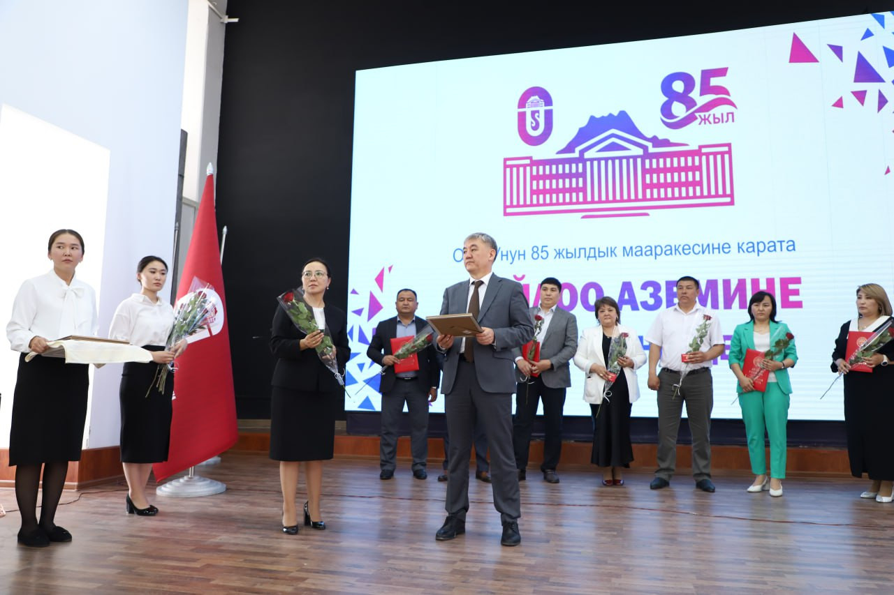 In celebration of the 85th anniversary, an award ceremony was hosted at the Osh State University. Rector Kudaiberdi Kozhobekov presented various accolades, including badges, Certificates of Honor, Certificates of Merit, and monetary awards to faculty and staff who have significantly contributed to the institution’s growth in education, scientific research, and healthcare, and who have diligently served for many years. Additionally, badges and certificates from the Ministry of Economy and Trade, the Ministry of Labor, Social Protection and Migration, Osh Region, Osh City Hall, Osh City Council, and the Central Committee of the Trade Union of Education and Science Workers were awarded to deserving recipients by the Osh regional trade union committee in honor of the anniversary.