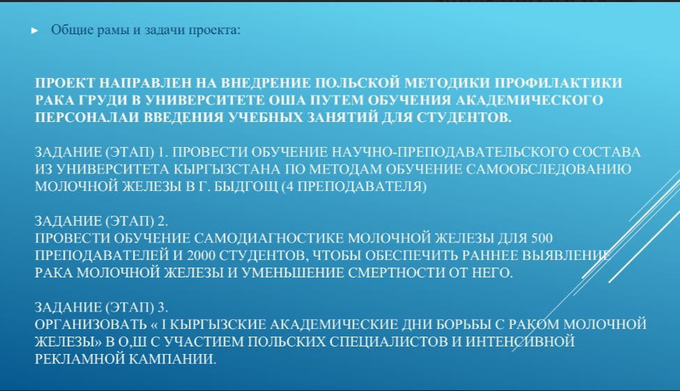 Objectives of the project: adapt and implement the Polish methodology for breast cancer prevention; train students in self-examination techniques; strengthen the public health system in the Osh region of Kyrgyz Republic. Participation in this project will not only enhance the professional skills of OshSU lecturers but also contribute to improving public health awareness and cancer prevention efforts in the region. The implementation of this project is planned in four stages, the first of which is the training of Osh State University teachers in the city of Bydgoszcz on September 14–19, 2025.