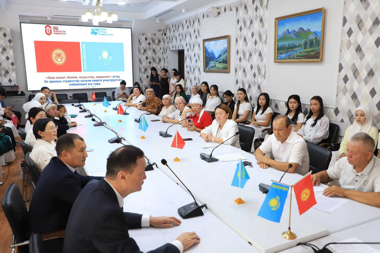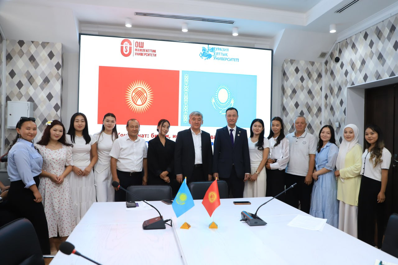 ОшМУда ачылган Казакстандын Л. Гумилёв атындагы Евразия улуттук университетинин филиалы элдерибиздин достугу менен ынтымагын, мамлекеттер ортосундагы ар тараптуу кызматташууну чыңдоого өбөлгө түзөрүн белгиледи. Учурда эки окуу жайдын ортосунда беш бакалавр, төрт магистрдик кош дипломдуу программа боюнча келишимдерге кол коюлган. Кош дипломдуу программанын алкагында 85 студент жана магистранттар билим алууда. Эми силер да эки өлкөнүн достугун, биримдигин чыңдаган, билимдүү жаштардын катарын толуктайсыңар. Мен силерге ишенем, окуу жайдын атын бир гана жакшы жагынан чыгарасыңар жана эң мыкты адис болуп чыгасыңар. Билим сапарыңарга ак жол каалаймын», -деди Кожобеков.