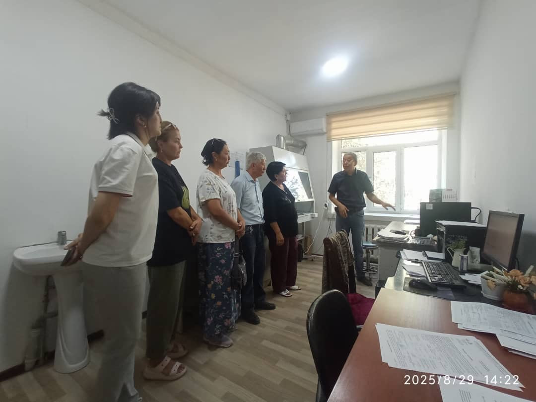ОшМУ, ОшТУ жана Улуттук илимдер академиясынын түштүк бөлүмүнүн Жаратылыш илимдери институтунун окутуучулары Гүлбара Осекова, Санайым Тажикбаева, Сажида Анарбай кызы жана Гүлсүн Токторбаева 29-августта Кадамжай район аралык оорулардын алдын алуу жана мамлекеттик санитардык-эпидемиологиялык көзөмөл борборунун аккредиттелген санитардык-гигиеналык лабораториясына иш сапары менен барышты.