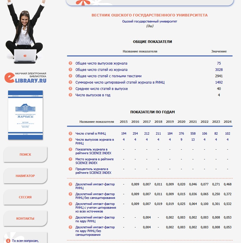 The impact factor of scientific journals at Osh State University has seen an increase, as revealed by the 2024 data from the Russian Science Citation Index (RSCI). The five-year impact factor of the “Bulletin of Osh State University” journal reached 0.288, while its two-year impact factor was 0.468.