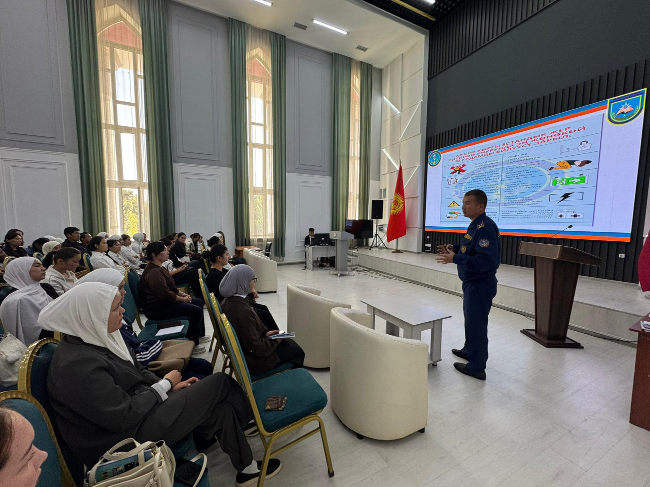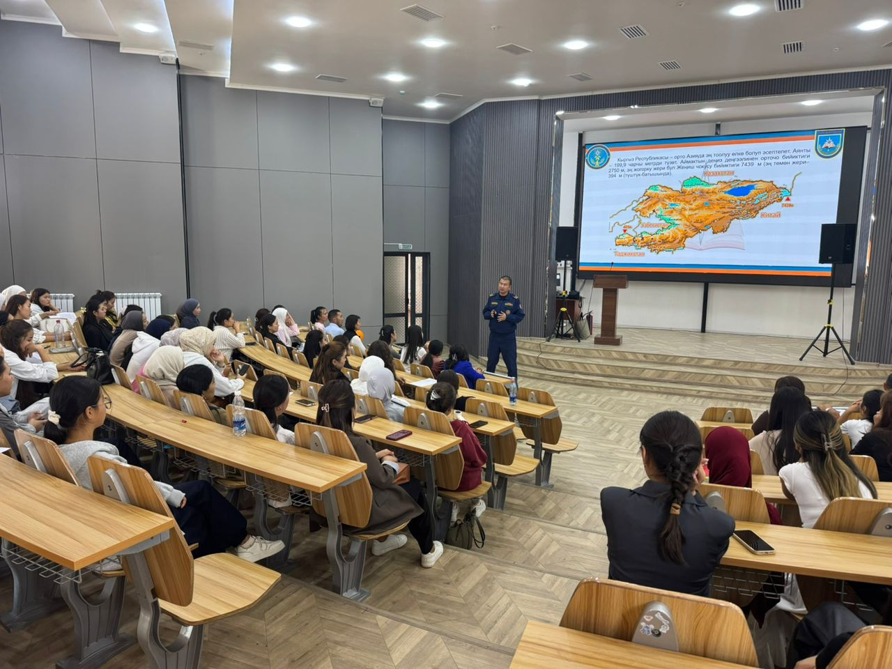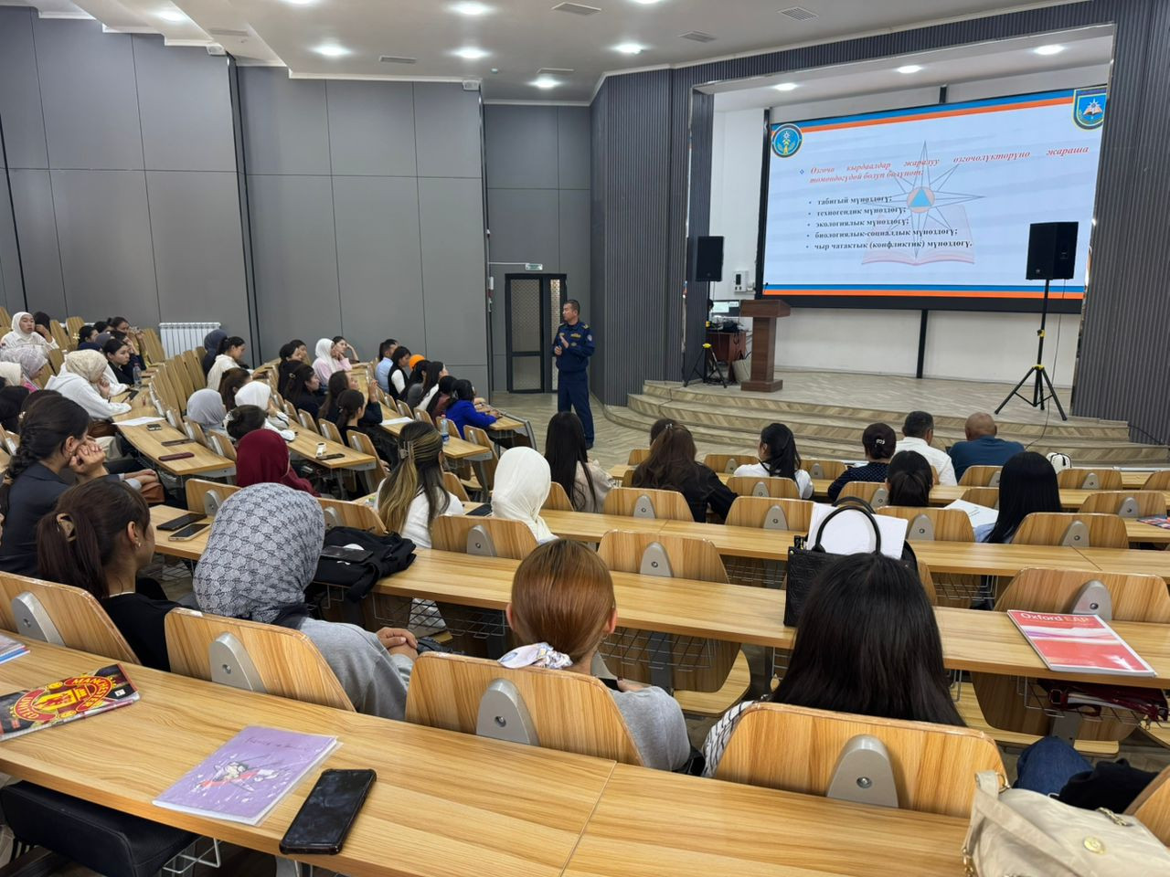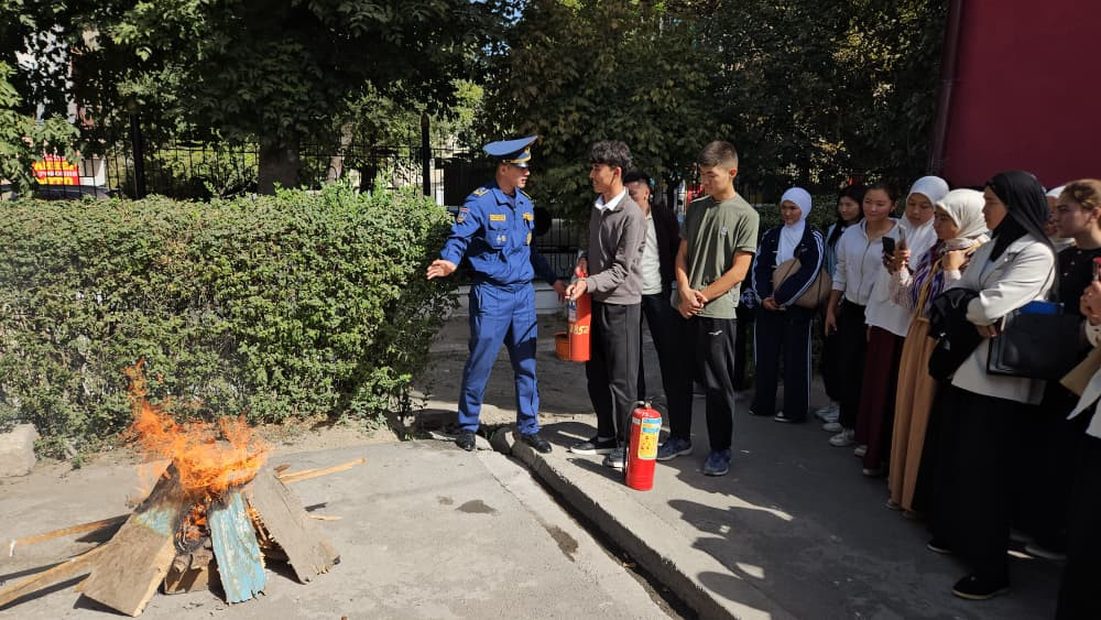 Анда студенттерге өзгөчө кырдаалдардын түрлөрү, табигый жана техногендик кырсыктар катталганда жарандардын өзүн алып жүрүү эрежелери, өрт кырсыктарын алдын алуу, коргонуу боюнча лекция окулуп, талкуу орун алды. Күндүн экинчи бөлүгүндө университеттин башка институт, колледждерине да маалыматтар берилип, өрт коопсуздугу боюнча машыгуулар өткөрүлөт.