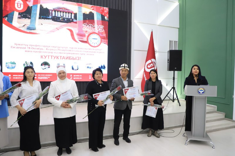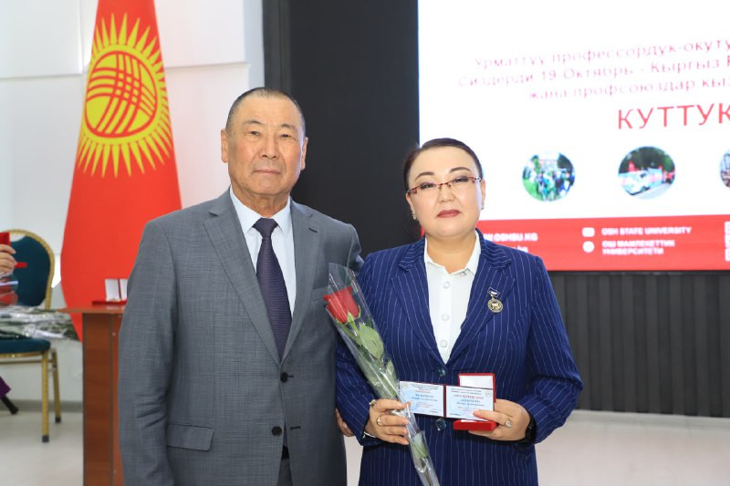 Seven employees were awarded the Central Trade Union Committee's ‘Excellence in Education and Science’ badge, and six were awarded certificates of honour. University Rector Kudaiberdi Kozhobekov and Legal Inspector of the United Trade Union Baktybek Turdubaev were awarded the ‘100 Years of the Trade Union’ medal.