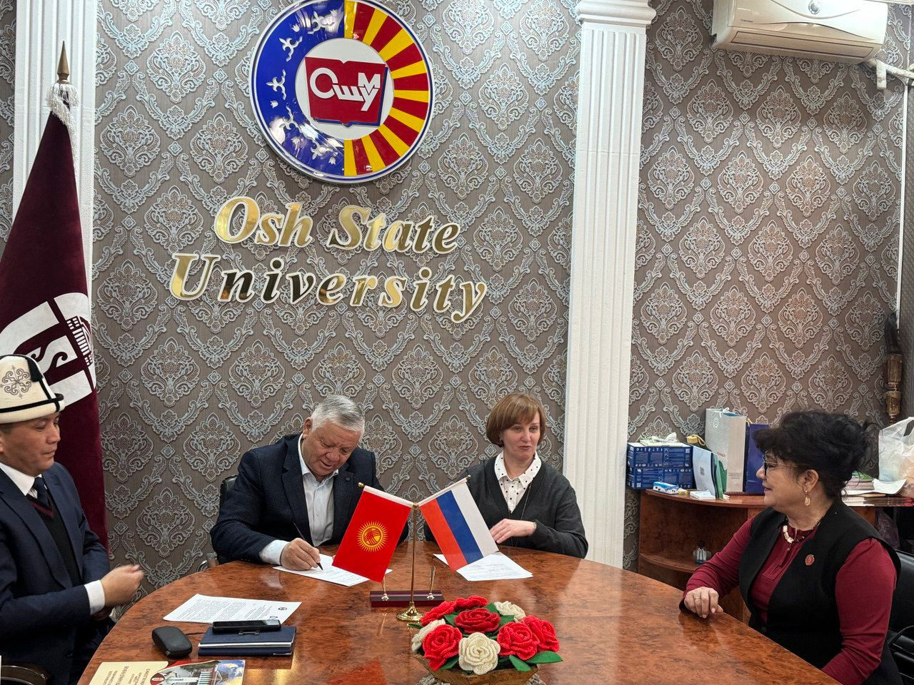 During the meeting, the parties discussed academic mobility, joint research projects, teacher training, and cultural initiatives. As a result, a cooperation agreement was signed, with special emphasis on strengthening scientific ties. The visit also included activities within the “Russian World” educational project and guest lectures for OshSU students and faculty.