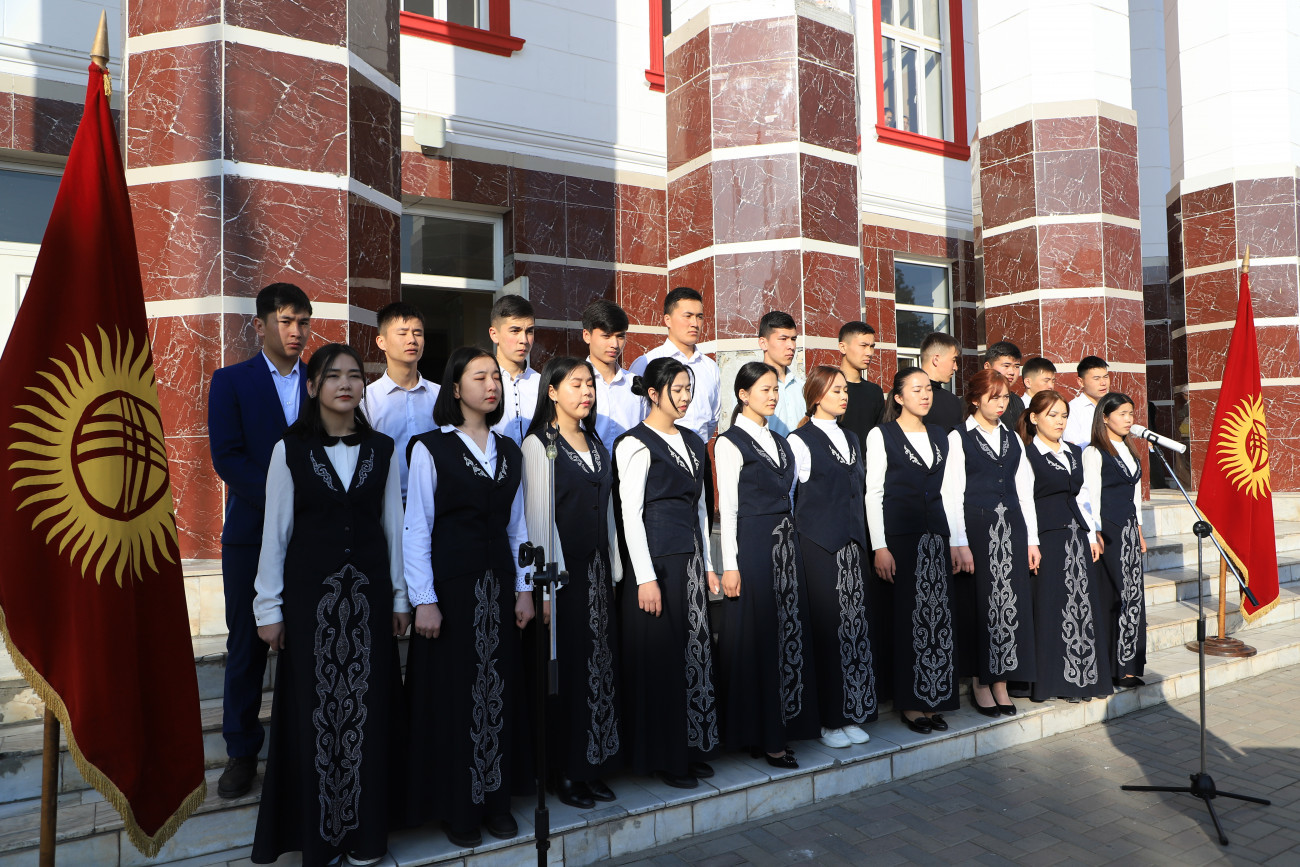 The anthem of the Kyrgyz Republic and then patriotic songs of the Kyrgyz people were performed by talented students. Rector of OshSU Kudaiberdi Kozhobekov congratulated on the Day of the State Flag, one of the main symbols and attributes of Kyrgyzstan.