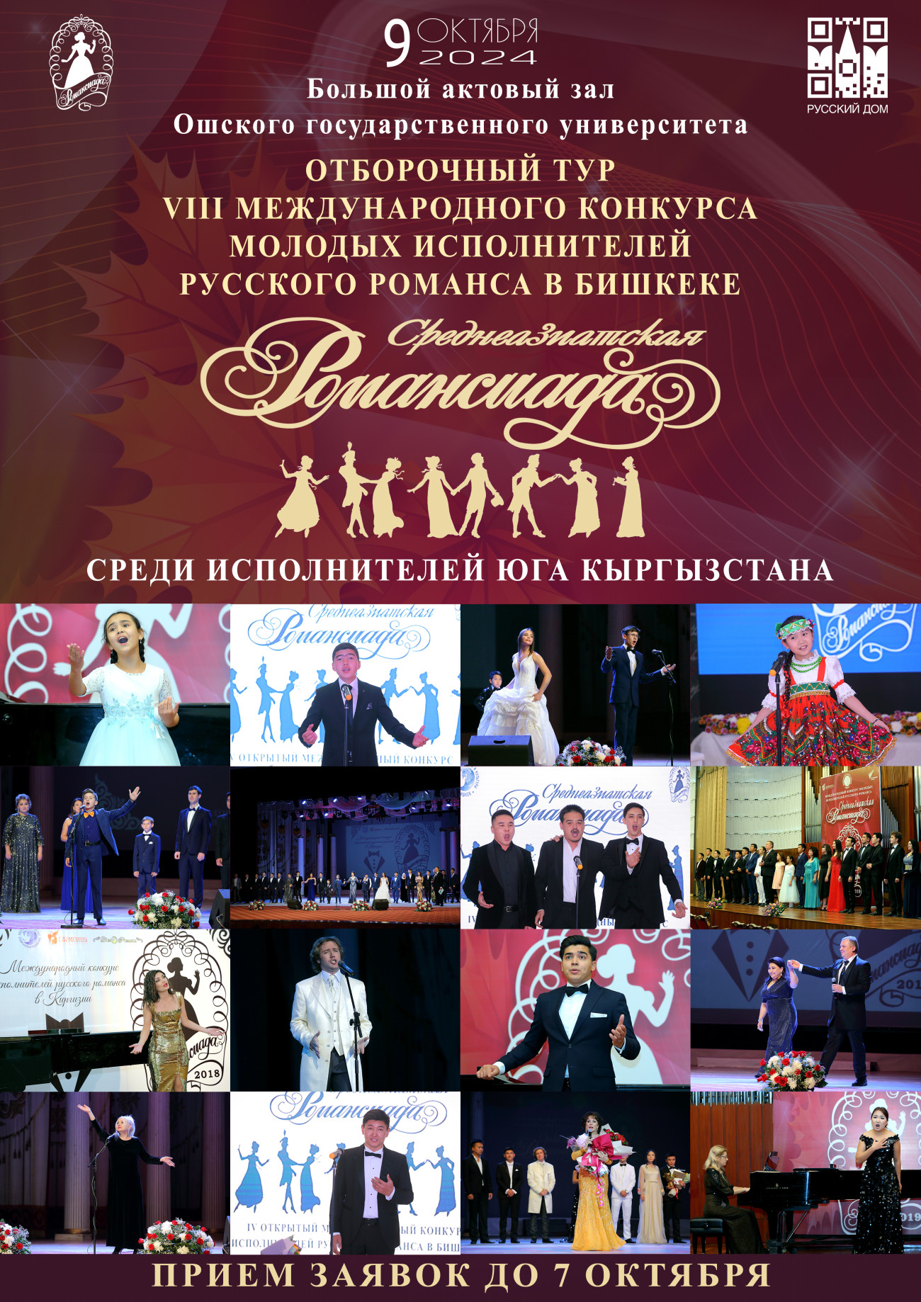 2024-жылдын 9-октябрында Ош мамлекеттик университетинин (Ош ш., Ленин көч., 331) башкы имаратындагы чоң жыйындар залында жаш аткаруучулар арасында «Орто Азия Романсиадасы» аттуу VIII Эл аралык орус романстары сынагынын тандоо туру өтөт.