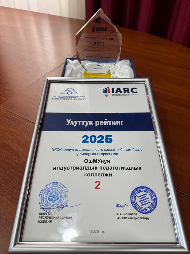 2025–2026-окуу жылында Көз карандысыз аккредитация, рейтинг жана лицензиялоо институту өткөргөн II улуттук рейтингдин жыйынтыгында ОшМУнун Индустриалдык-педагогикалык коллежи республика боюнча алдыңкы окуу жайлардын катарына кирди.