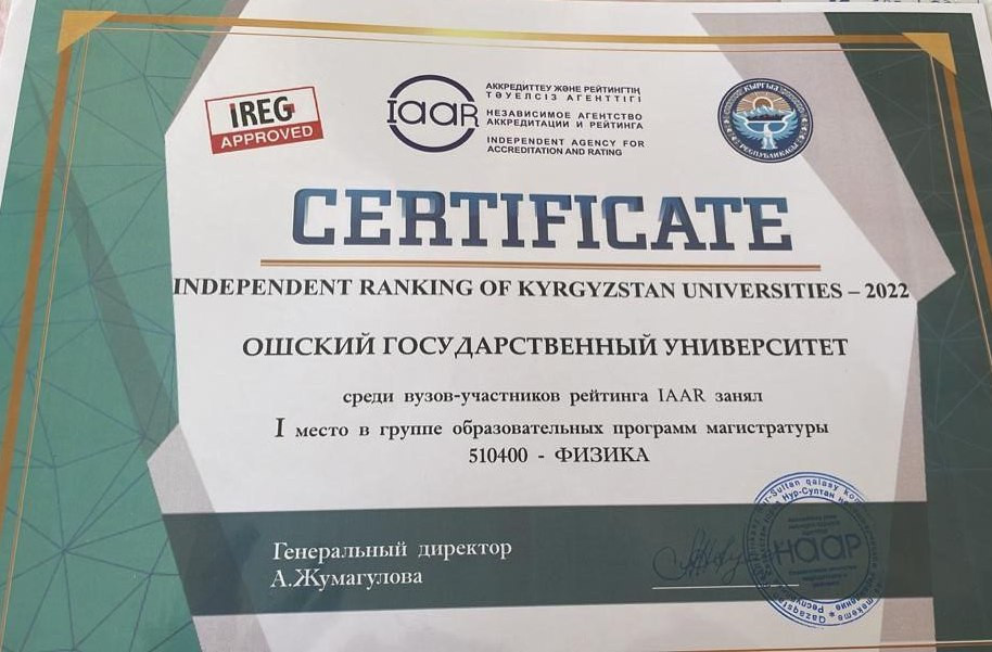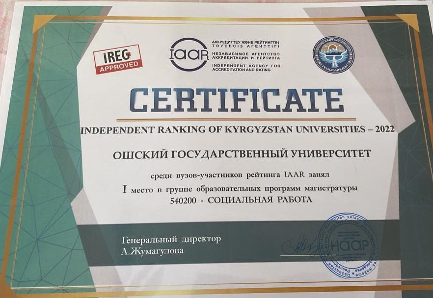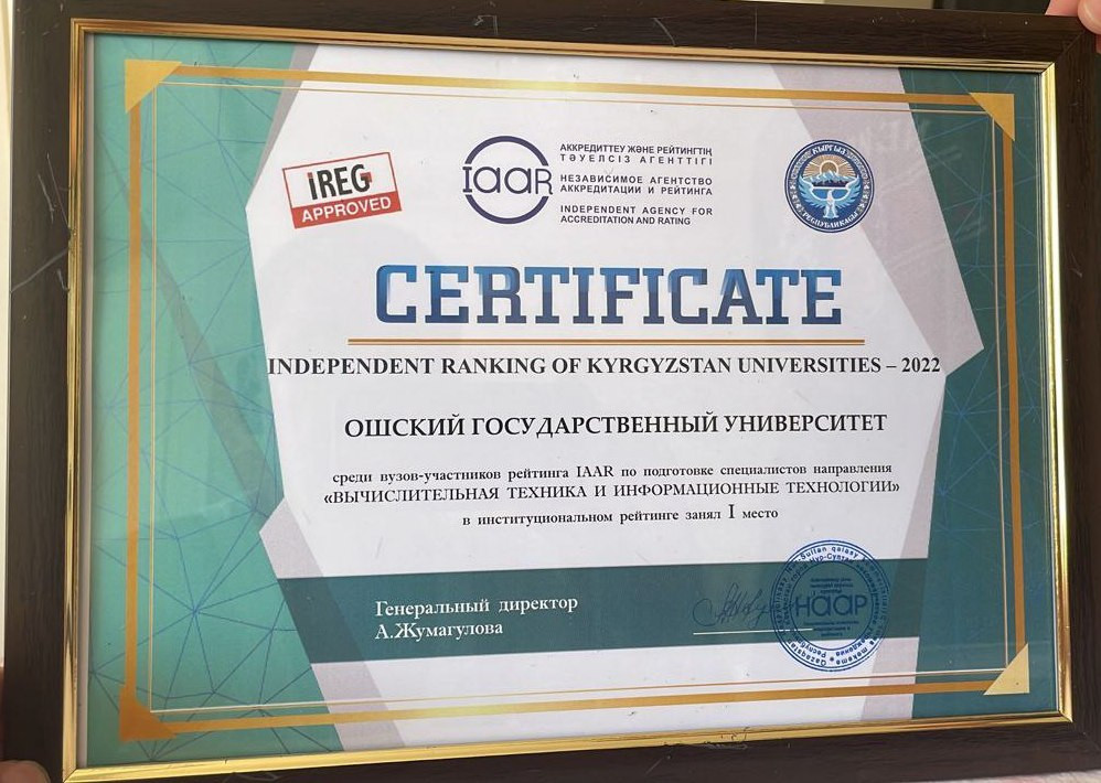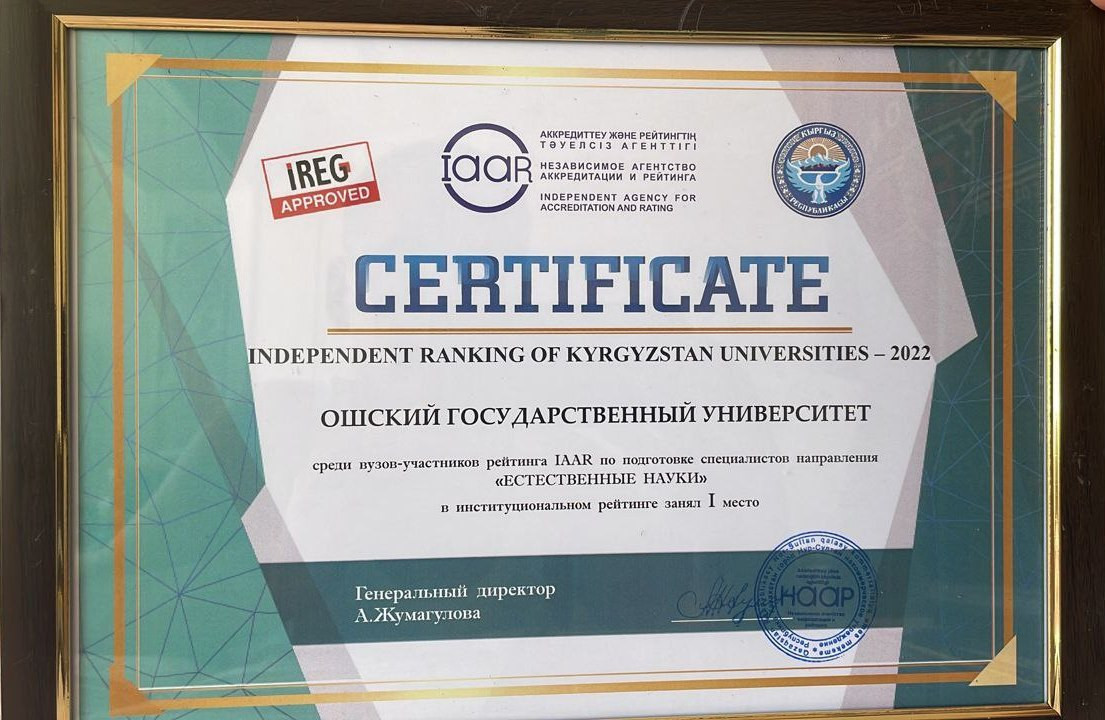 По итогам “Рейтинга вузов Кыргызстана -2022", проведенного независимым агентством аккредитации и рейтинга (НААР), в общем генеральном рейтинге ОшГУ занял первое место, за что университет удостоился сертификата и специальной статуэтки.