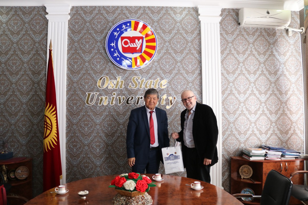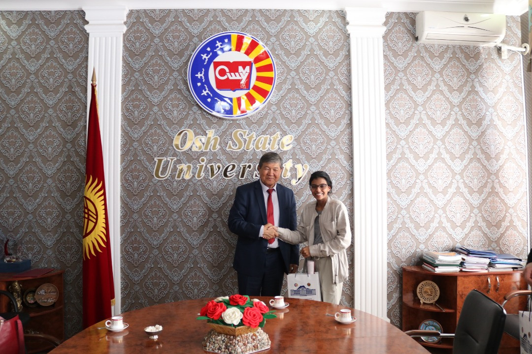 Сегодня директор департамента международных связей ОшГУ А.Абдувалиев принял волонтеров из США Темати Воол и Мариям Маликти .