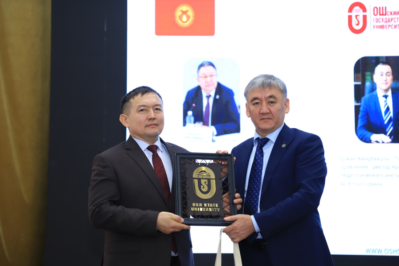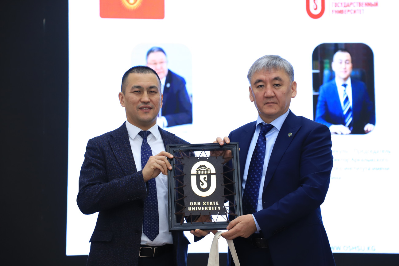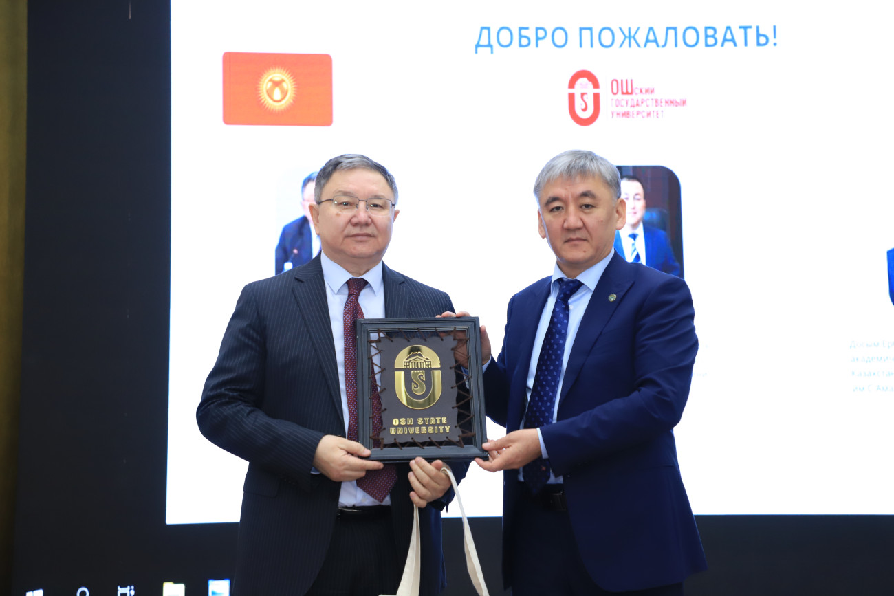 Сегодня в ОшГУ прибыла делегация руководителей и ученых Казахстанских университетов. Гостей встретили руковдители ОшГу во главе с ректором Кудайберди Кожобековым.