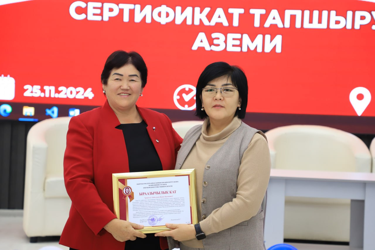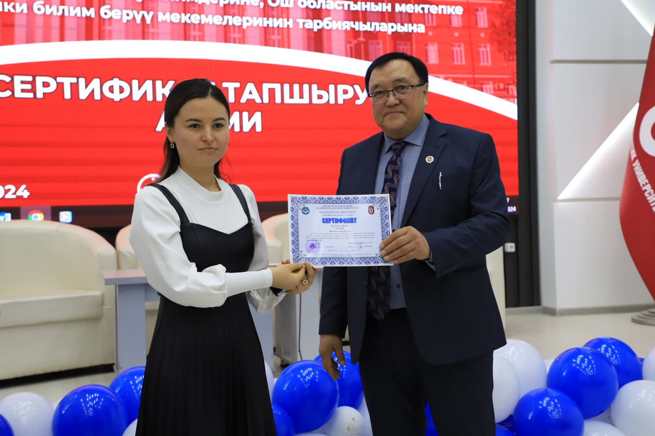25 ноябр в ОшГУ сосотоялось вручение сертификатов о повышении квалификации. 90 учителей из Узгенского, Карасуйского районов и воспитателей детских садов прошли обучение по направлениям развитие профессилональных компетенций педагогов, работающих в дошкольных учреждениях, подготовке к республиканскому тестированию, овладению теоретических и практических способностей на уровне В2, С1 по предметам кыргызский язык, математика.
