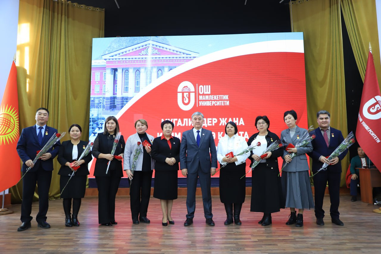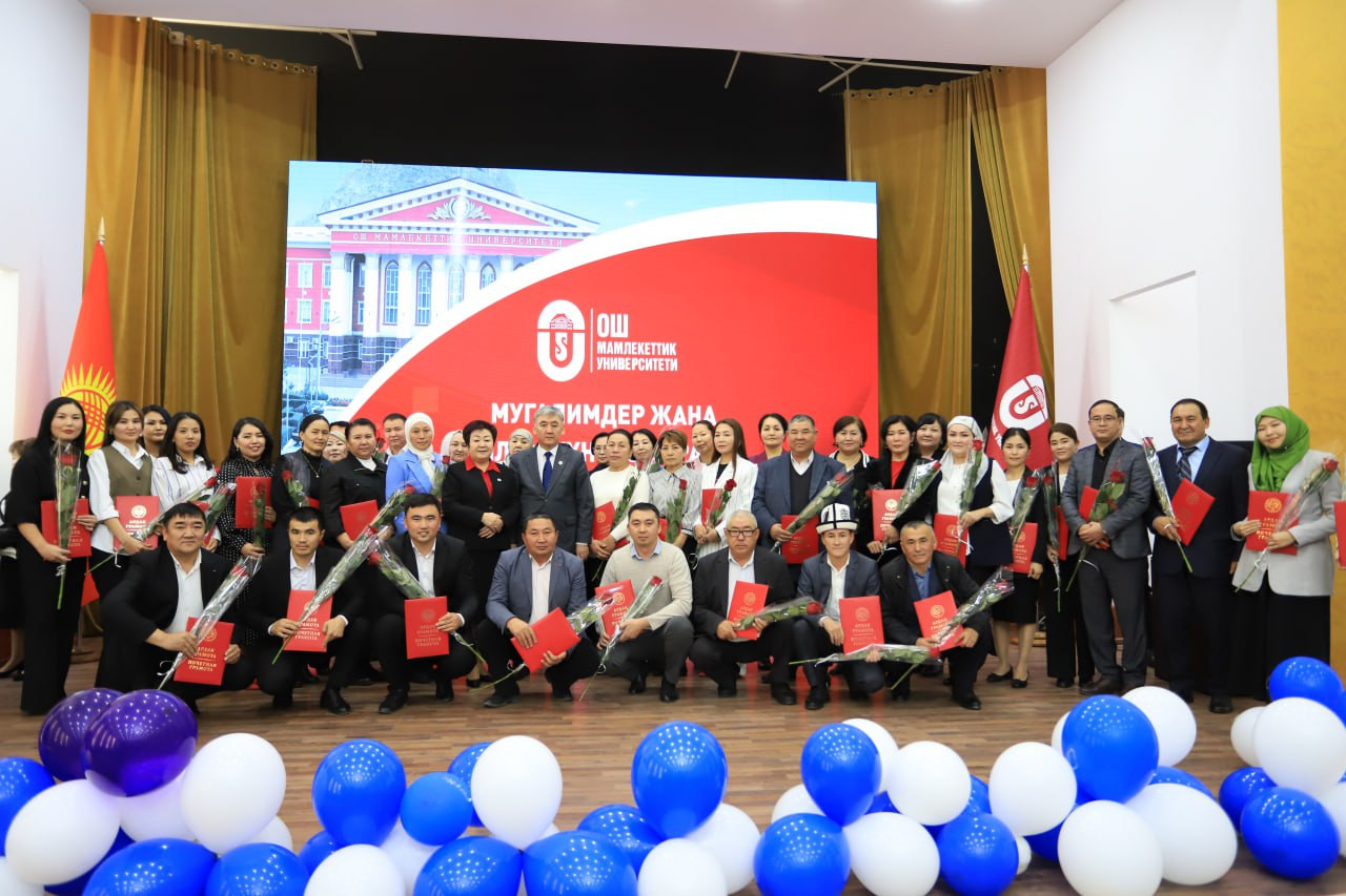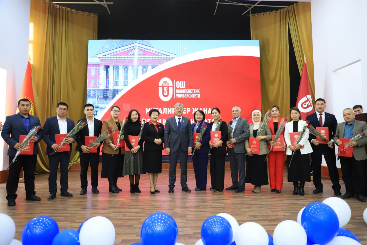 Группе профессорско-преподавательского состава, плодотворно работающей в университете, были вручены нагрудные знаки Министерства образования и науки "Отличник образования", “Отличник науки", почетные грамоты местых органов власти, Министерства образования и науки, ОшГУ, нагрудный знак “Заслуженный работник ОшГУ”, денежные премии и благодарственные письма.