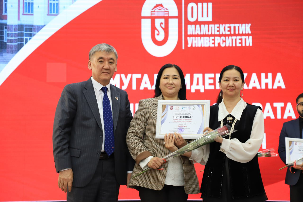 На церемонии награждения ректор вручил премию в сумме 200 тысяч сомов учителю математики лицея “Билим” ОшГУ Назгуль Каныбековой, победившей в республиканском конкурсе “Лучший учитель года - 2024”.