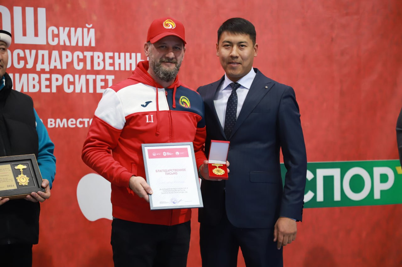 За вклад в развитие мини-футбола в регионе ректору ОшГУ Кудайберди Кожобекову вручен нагрудный знак “Благодарность” футбольной ассоциации .ОшГУ является основным спонсором турнира.