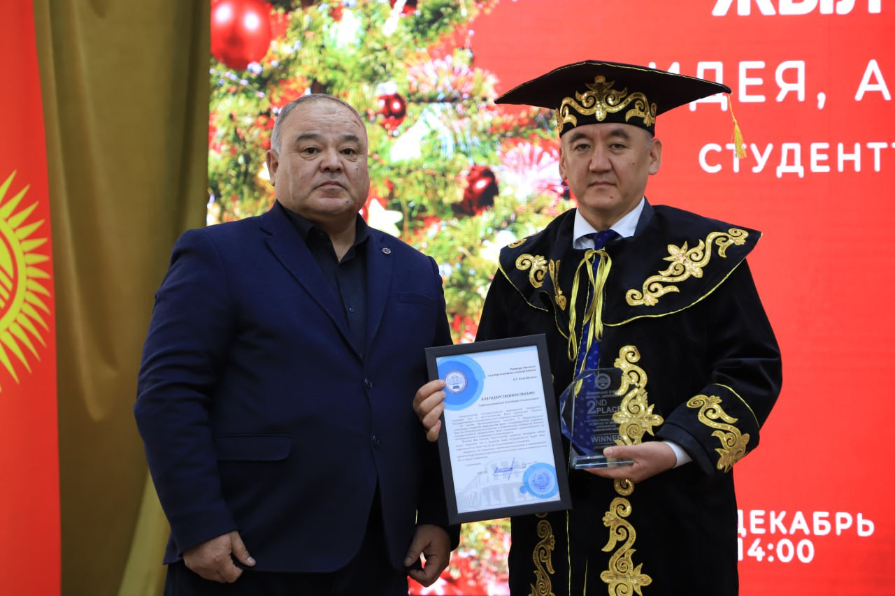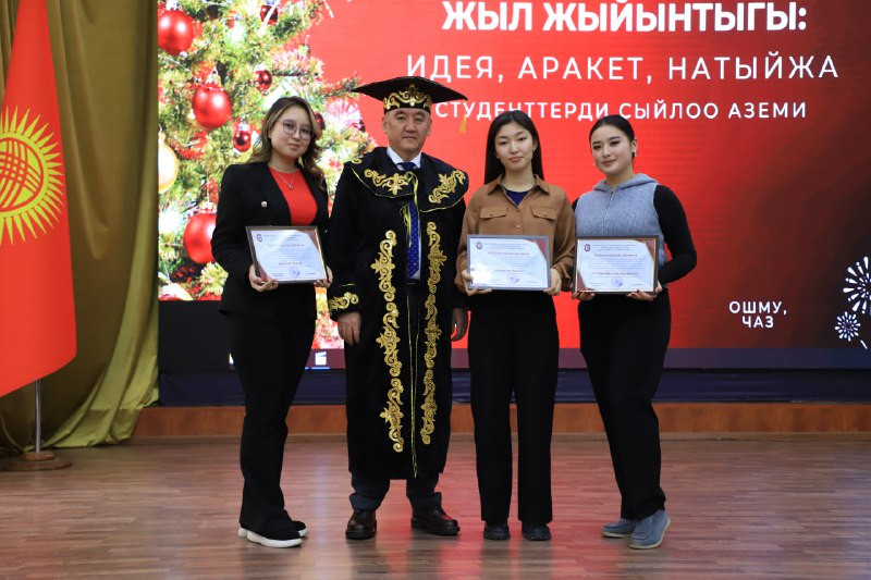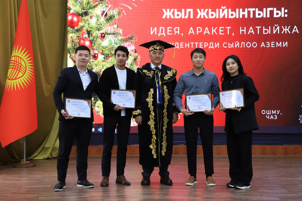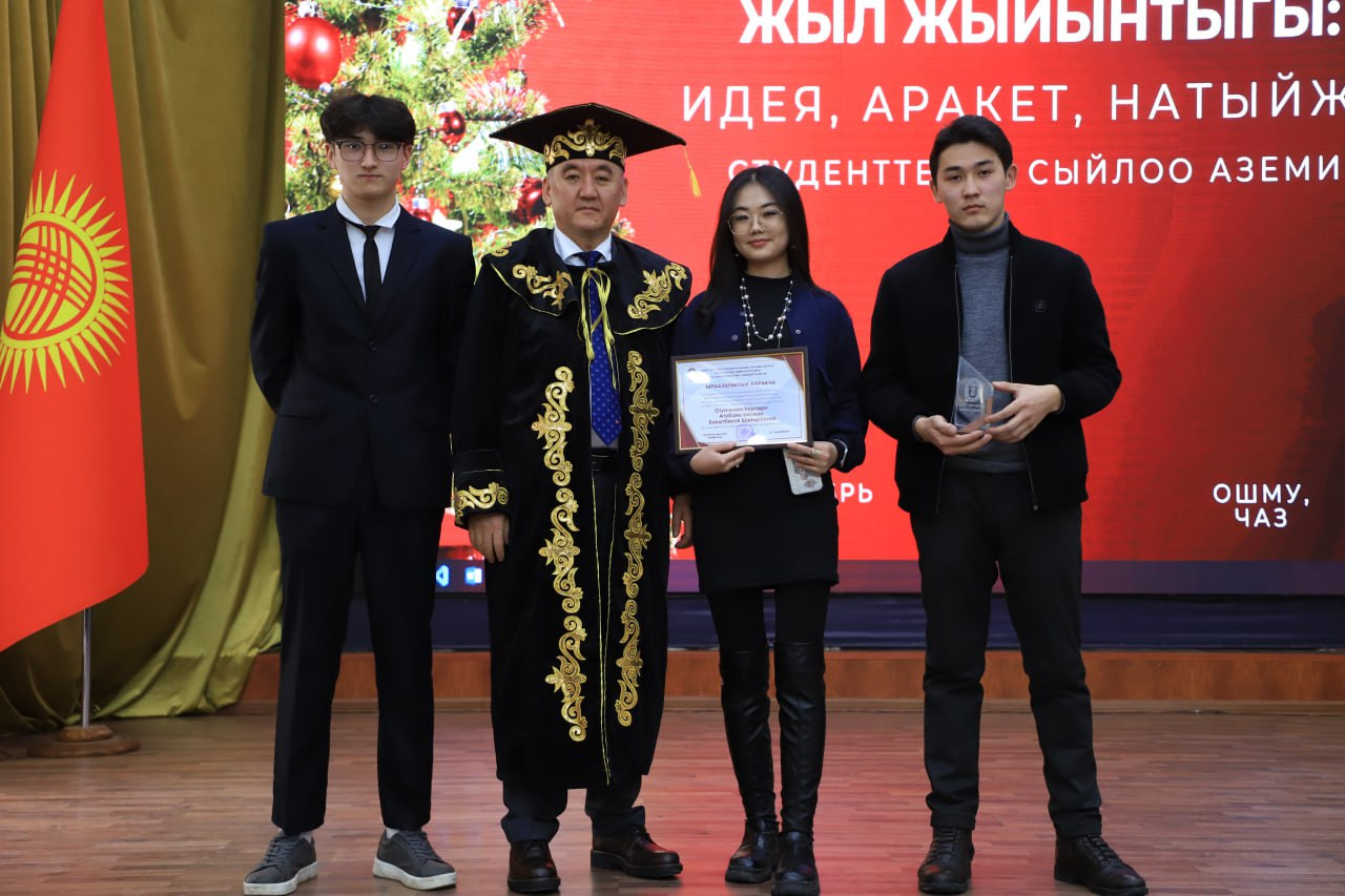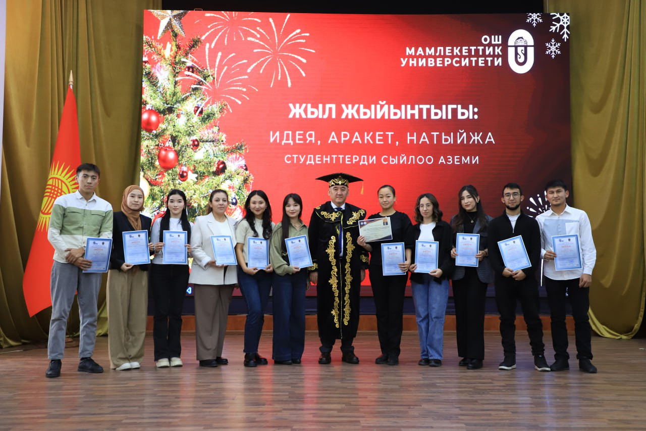 В Ошском государственном университете прошла церемония награждения лучших студентов года “Идея, действие, результат”. На IT Fest 2024 "Cyber kyrgystan" были награждены студенты Института математики, физики, техники и информационных технологий, занявшие первые места по киберспорту, хакатону и робототехнике. Также были награждены студенты-победители по стартап-проектам “G-Face”, “ZN incluzive”. Награды получили студенты Института историко-юридического института, ставшие финалистами Евразийской проектной школы, студенты индустриально-педагогического колледжа, победители первого республиканского чемпионата “World skill'S Кыргызстан" и добившиеся успехов в конкурсах "Fashion Hakaton Кыргызстан", "Eco-Fashion Kyrgystan" среди колледжей, организованных Центром развития текстиля, студенты медицинского факультета, занявшие призовые места на международной олимпиаде “Самарканд-2020”, волонтерские команды “Girls style”, "Творцы", завоевавшие четыре звезды в республиканском туре Клуба веселых и находчивых, также получили призы.