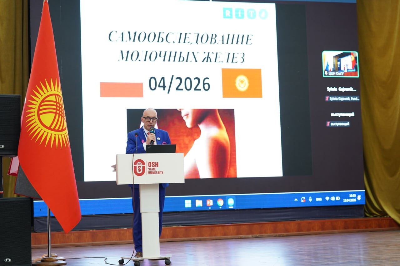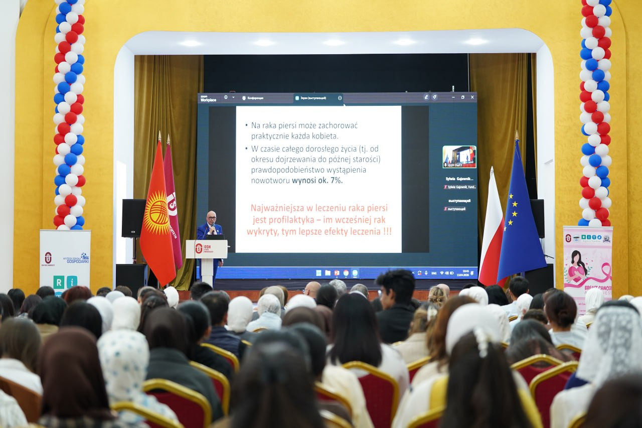 Затем мероприятие продолжилось в большом конференц-зале университета. Были представлены доклады о результатах проекта, его значимости и реализации. Также была представлена совместная кыргызско-польская профилактическая программа по профилактике рака молочной железы и отмечено её место в системе здравоохранения.