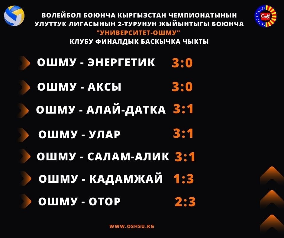 Команда ОшГУ по волейболу "Университет» приняла участие во втором туре Национального чемпионата Кыргызстана в Бишкеке. По результатам встреч с семью командами "Университет" занял второе место и вышел в финальную часть чемпионата.
