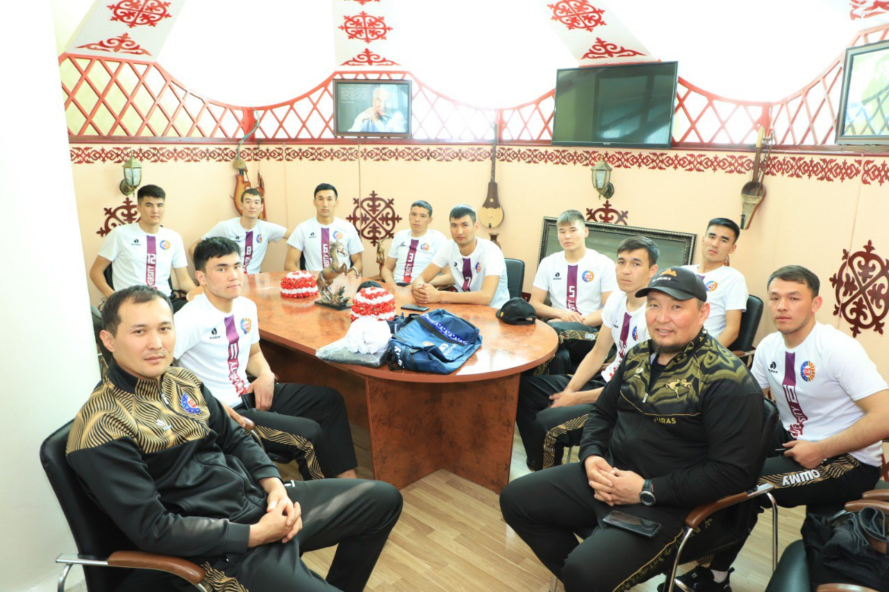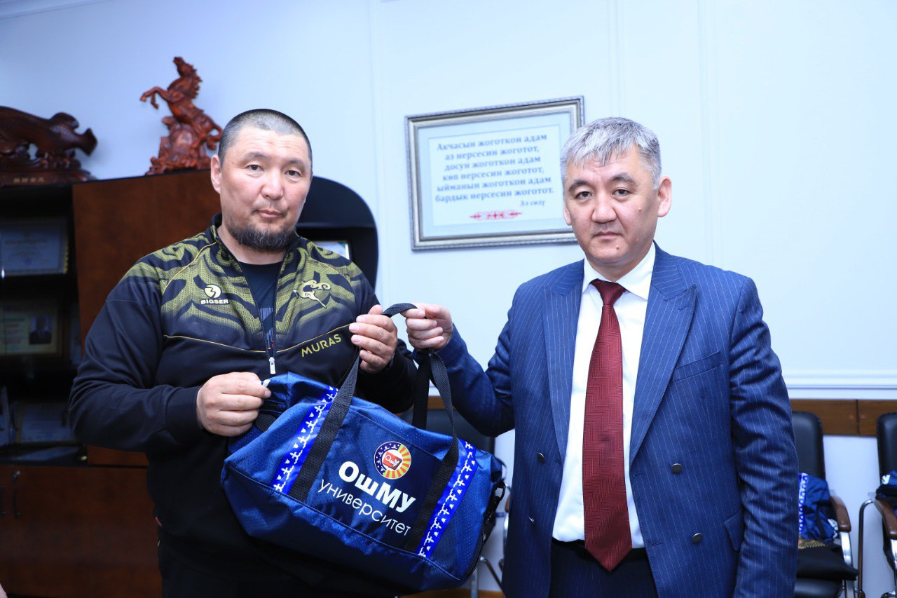 Ректор ОшГУ, президент волейбольного клуба "Университет" Кудайберди Кожобеков вручил спортсменам парадную форму, выразил дальнейшую поддержку в развитии деятельности клуба и пожелал удачных выступлениий на финальном этапе национального чемпионата КР.