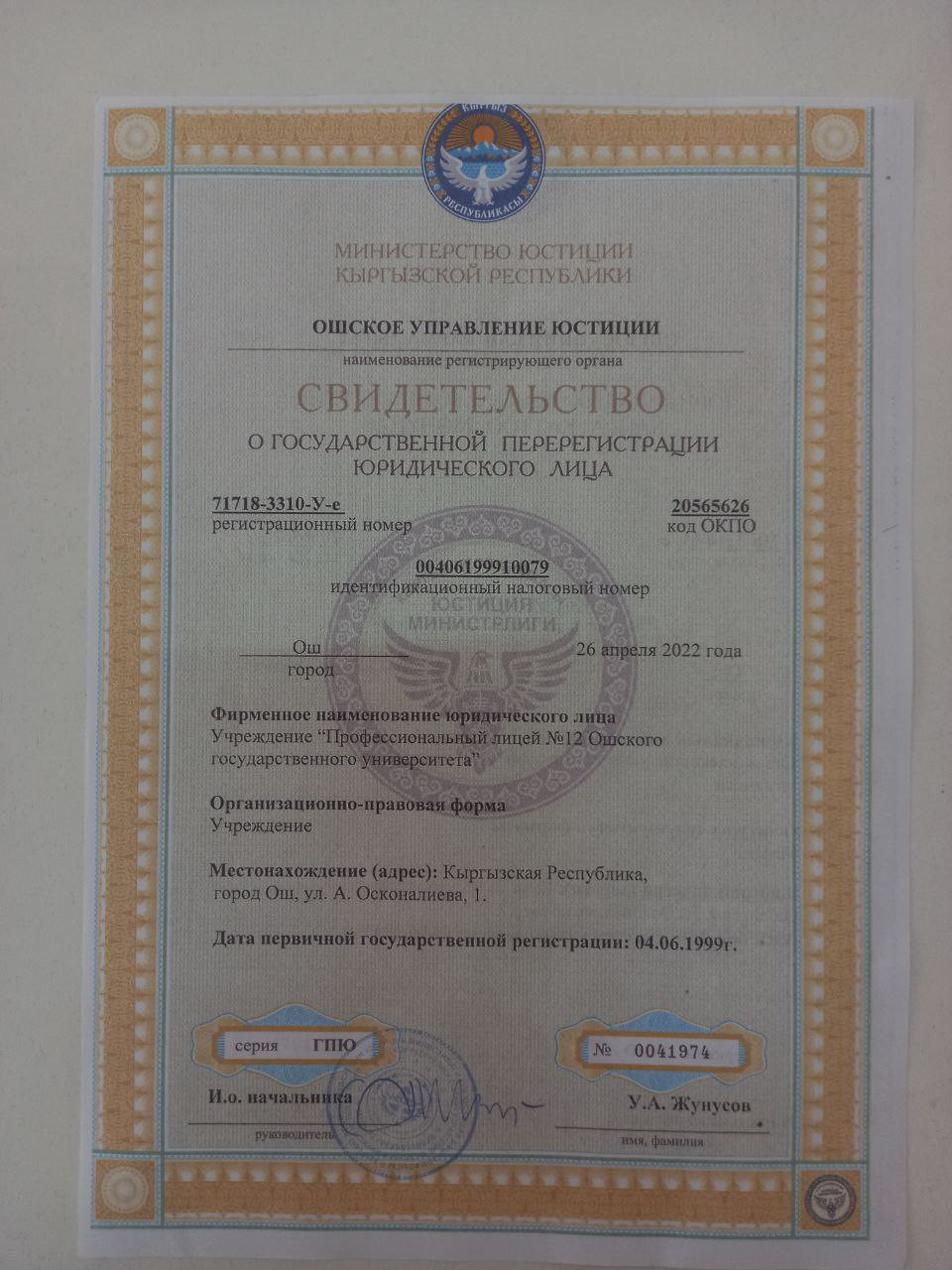 Учебное заведение прошло регистрацию в минстерстве юстиции как "Профессиональный лицей №12 Ошского государственного университета" 26 апреля 2022 года.
