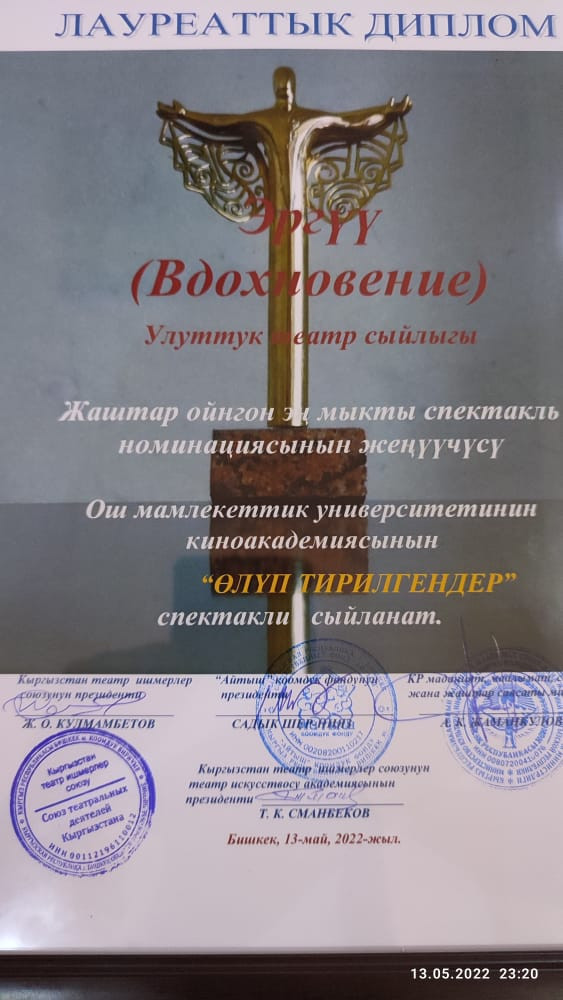 Коллектив киноакадемии за спектакль “Олуп тирилгендер”(Воскресшие) по произведению Ж. Садыкова удостоились национальной премии “Эргуу”(Вдохновение).. выиграв номинацию. "Лучший спектакль".. А студентка киноакадемии Сезим Эшинбек кызы удостоилась номинации "Лучшая роль спектакля".