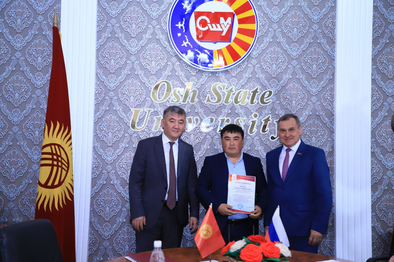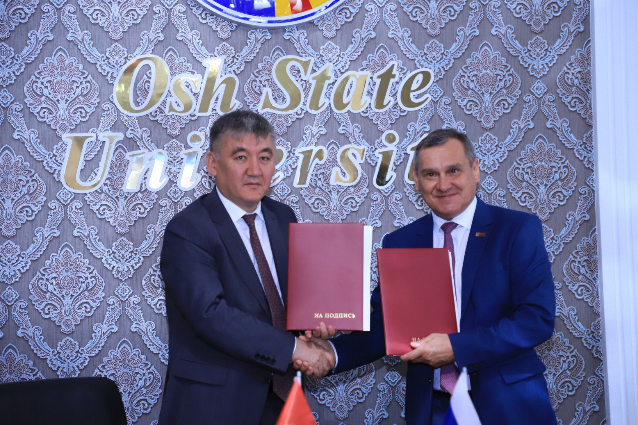 Ректоры вузов подписали договор по совместной реализации программы двойного диплома по специальности русский язык с дополнительным английским на базе факультета русской филологии ОшГУ. Согласно образовательной программе новой специальности студенты первые два года будут обучаться в ОшГУ, последующие два года - в ЧГПУ и по окончании получат дипломы двух вузов.