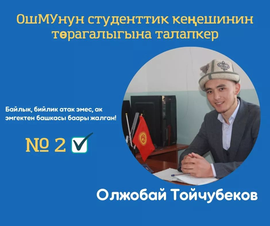 №2 - студент 2 курса факультета кыргызской филологии и журналистики Тойчубек уулу Олжобай.