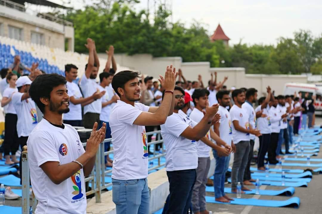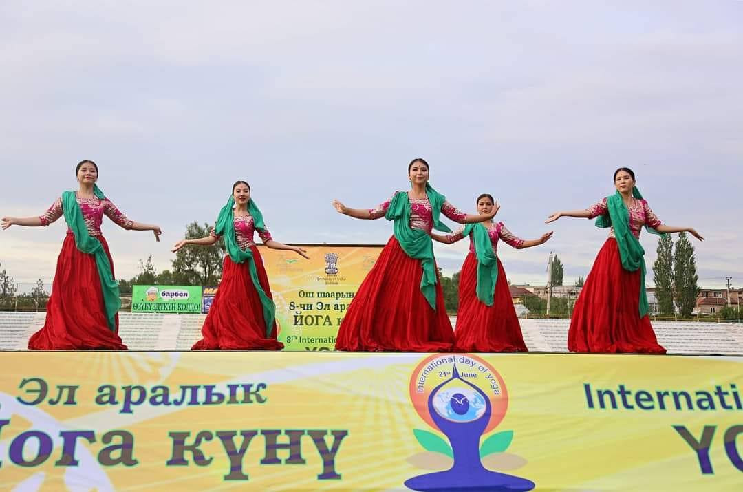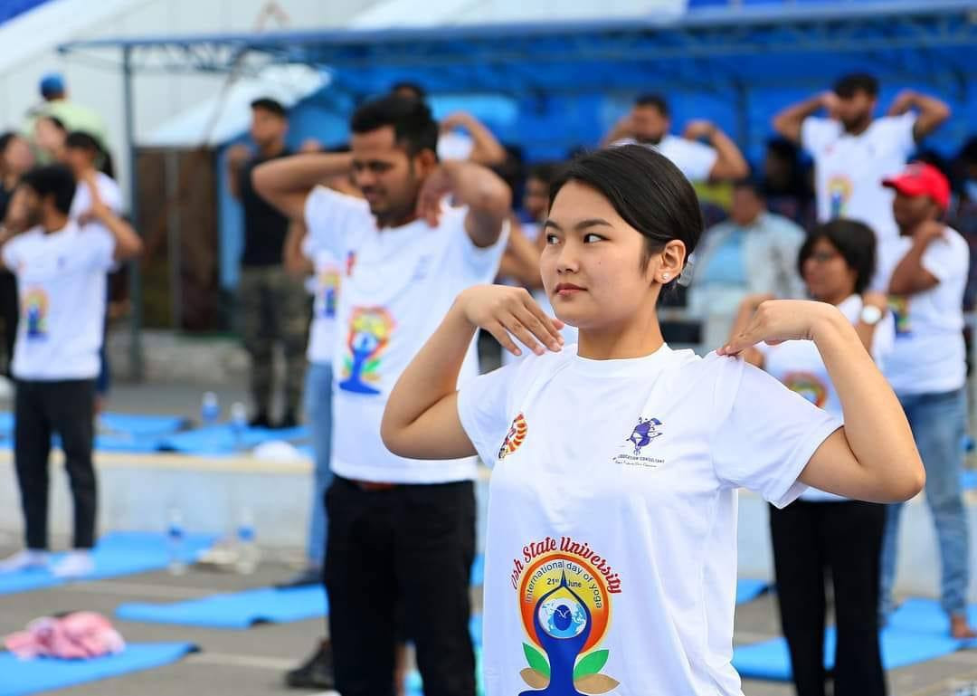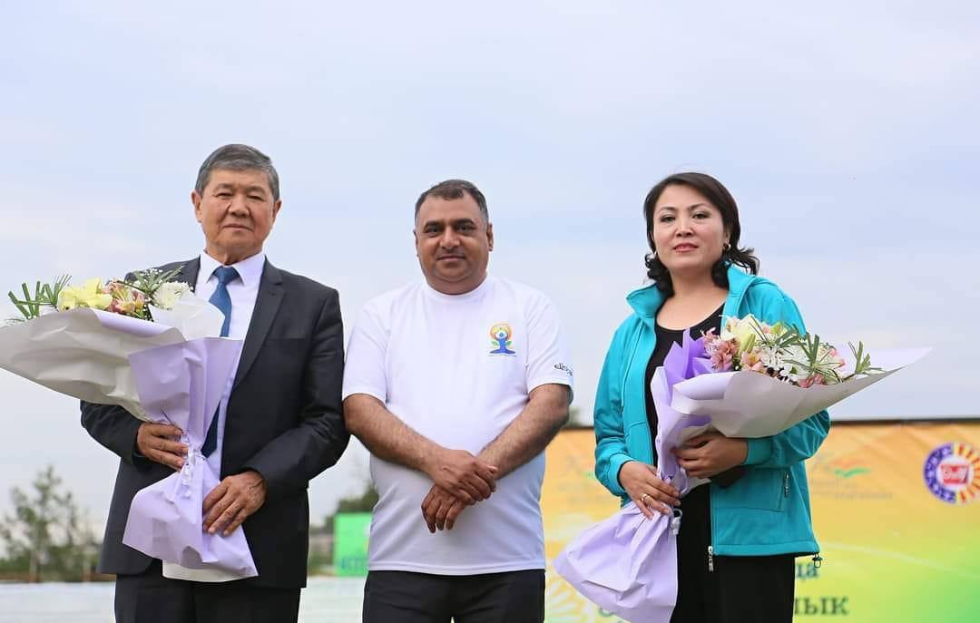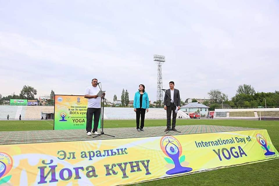 На центральном стадионе г. Ош имени Суюмбаева прошло мероприятие, посвященное 8 международному дню йоги, на котором приняли участие вице-мэр города Венера Рыскулова, временно поверенный в делах Индии в КР господин Раджеш Кумар, директор департамента международных связей ОшГУ Абдыганы Абдувалиев, преподаватели, студенты, молодежь города.