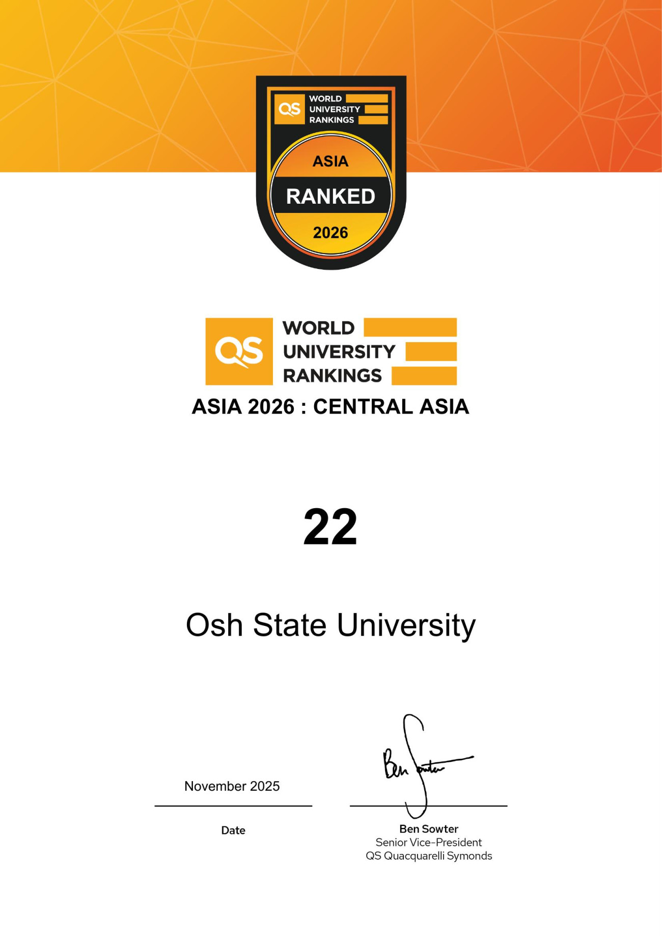 Geçen yılki QS Asya 2025 sıralamasına (30,0 puan) kıyasla, Oş Devlet Üniversitesi 2026'da toplam 39,9 puan elde etti. Önemli iyileşme gösteren ana kriterler akademik itibar, işveren itibarı, uluslararası öğretim kadrosunun oranı ve öğretim kadrosunun kalitesiydi ve bunların tümü 2025'e kıyasla altı puan arttı.