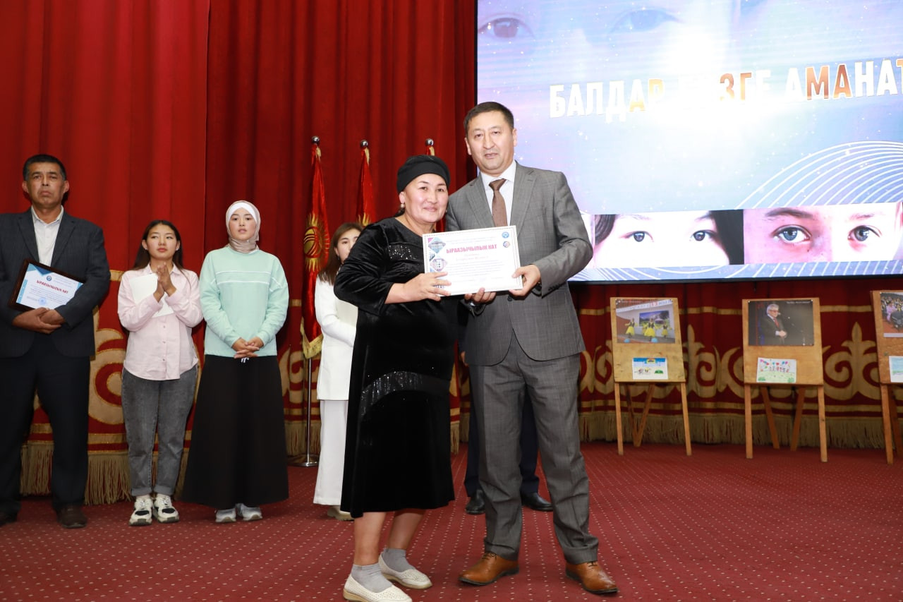 Салтанаттын жүрүшүндө “Балдар - бизге аманат!” долбоорунун эстафетасы Чүй жатак мектебинен Өзгөндөгү Марат Раззаков атындагы мектеп-интернатына өткөрүлүп берилди.