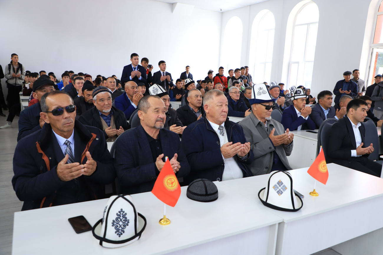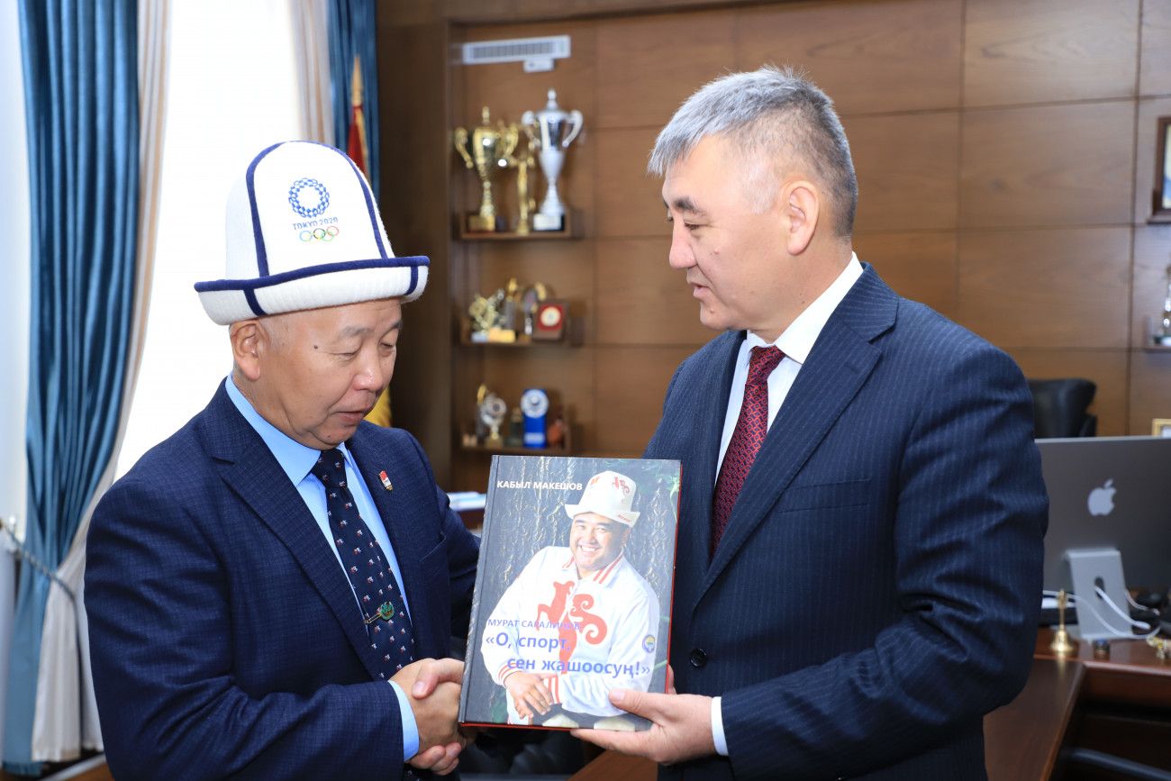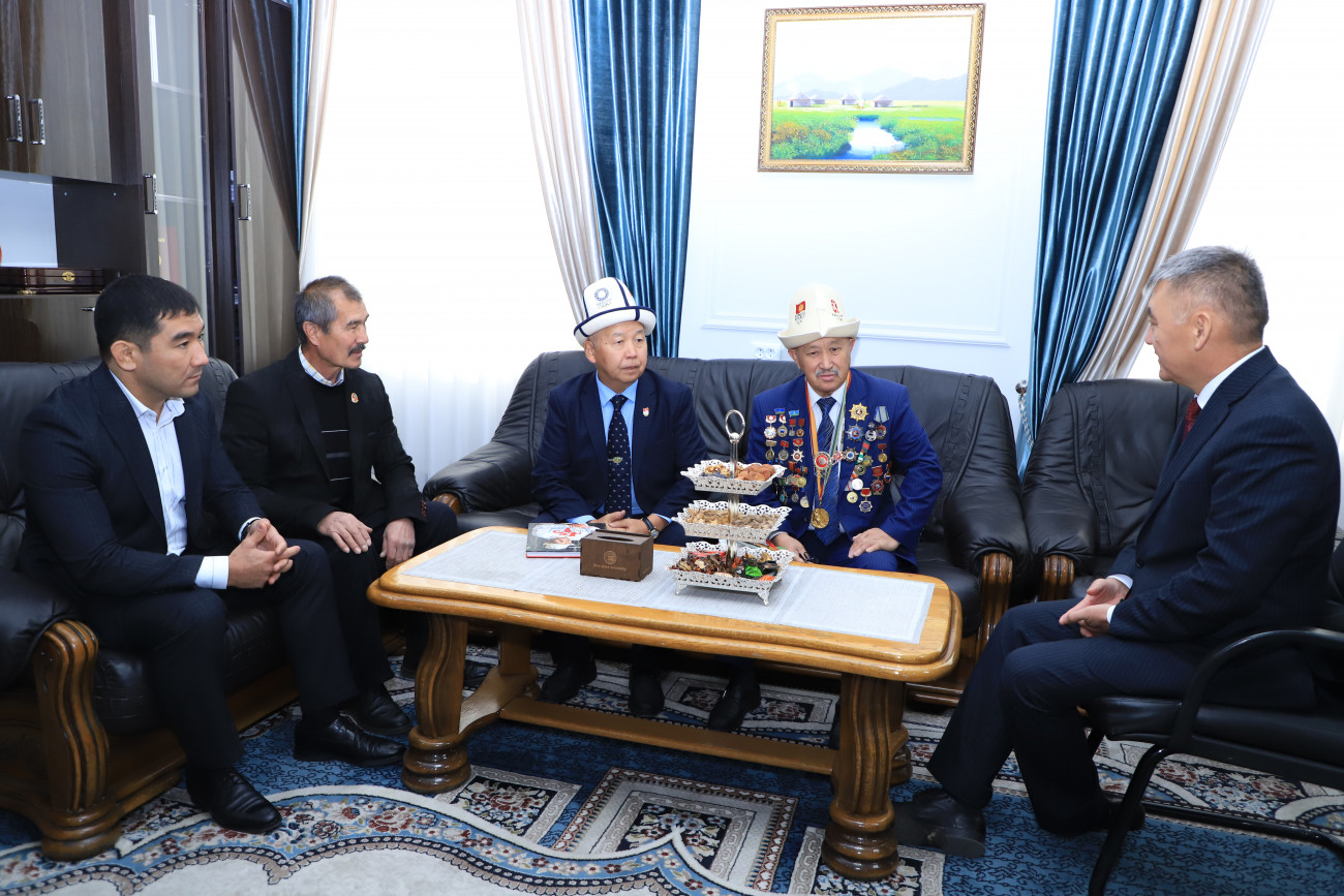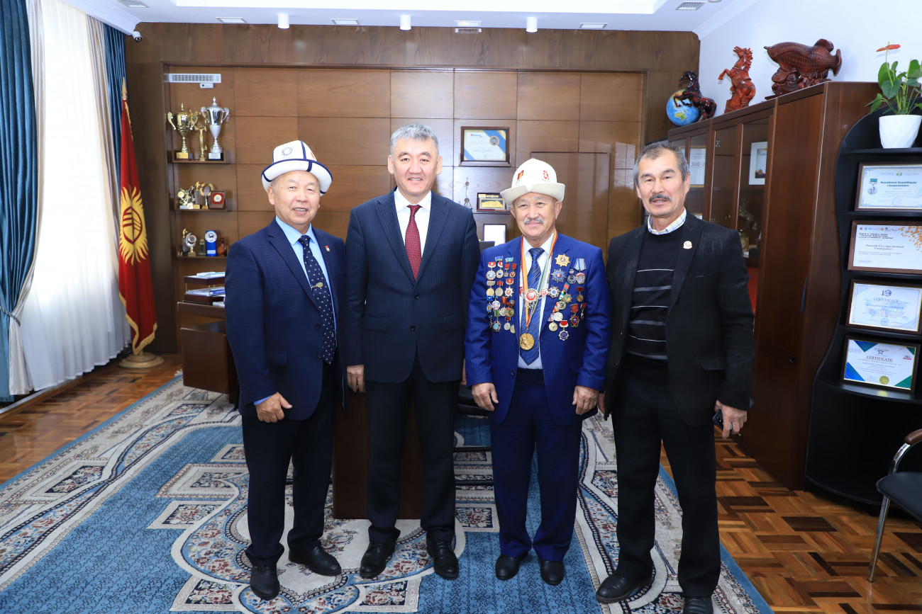 Алар окуу жай жетекчиси Кудайберди Кожобеков менен жолугуп, баарлашты. Ректор өз сөзүндө университетте спорт багытындагы аткарылган алыгылыктуу иштер, студенттердин жетишкендиктери боюнча маалымат берди. Жолугушуунун аягында Каныбек Осмоналиев өзүнүн калемине таандык эки китебин белекке берди. Ошондой эле, автордук китептерин окуу жайдын китепканасына тапшырды.