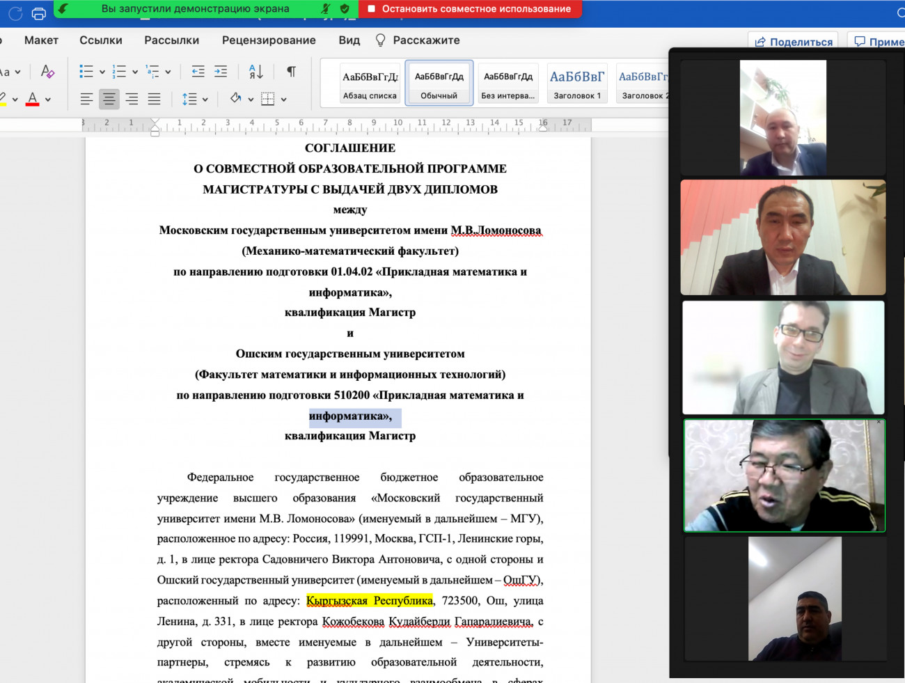 М.В. Ломоносов атындагы Москва мамлекеттик университетинин өкүлдөрү менен ОшМУнун ортосунда кезектеги видеоконференция болуп өттү. Иш-чарада эки окуу жайдын ортосунда магистратура программасы боюнча «Колдонмо математика жана информатика» багытында биргелешкен билим берүү программасын түзүү жөнүндө сүйлөшүүлөр орун алды.