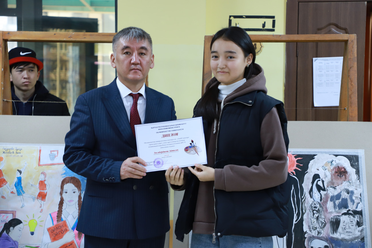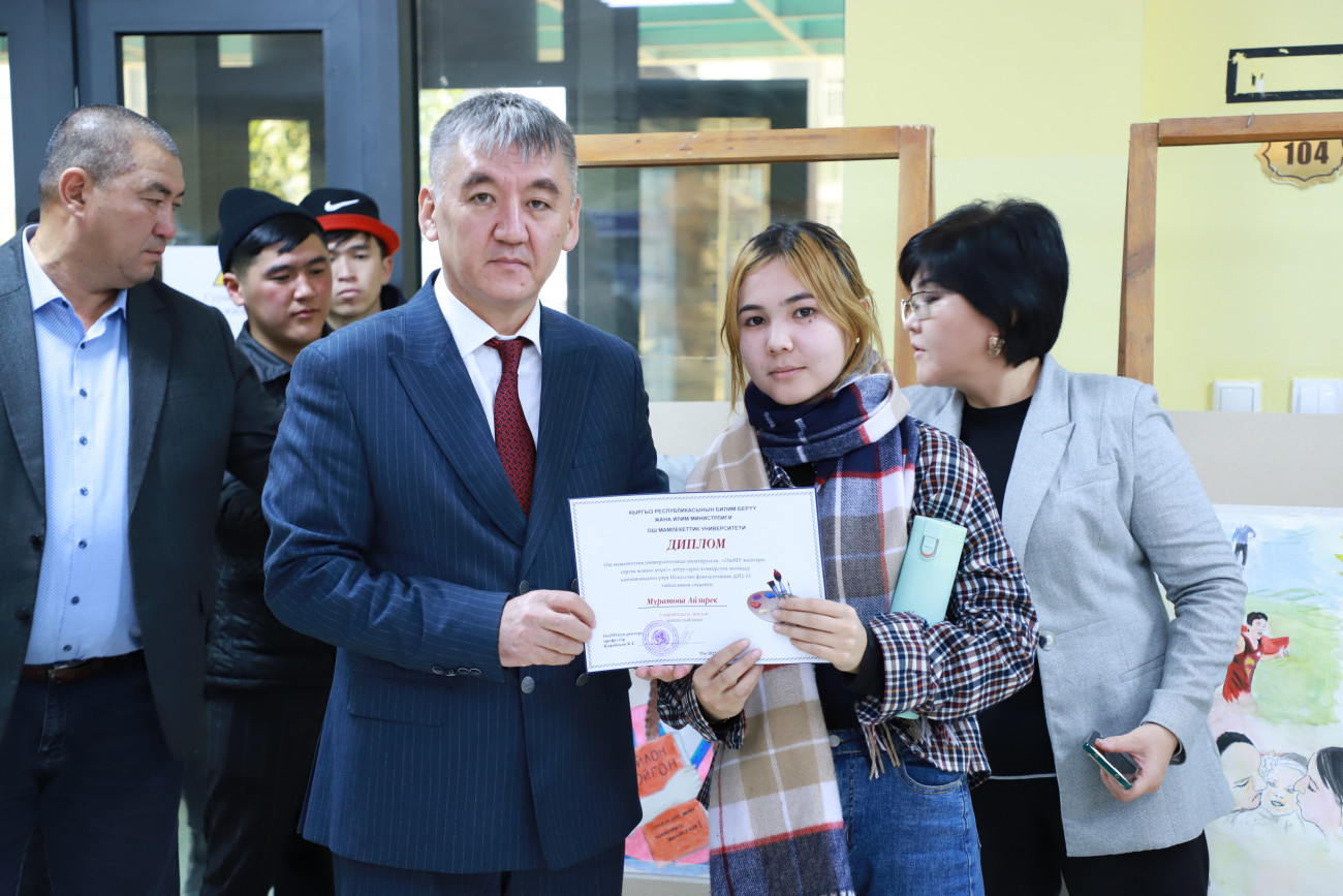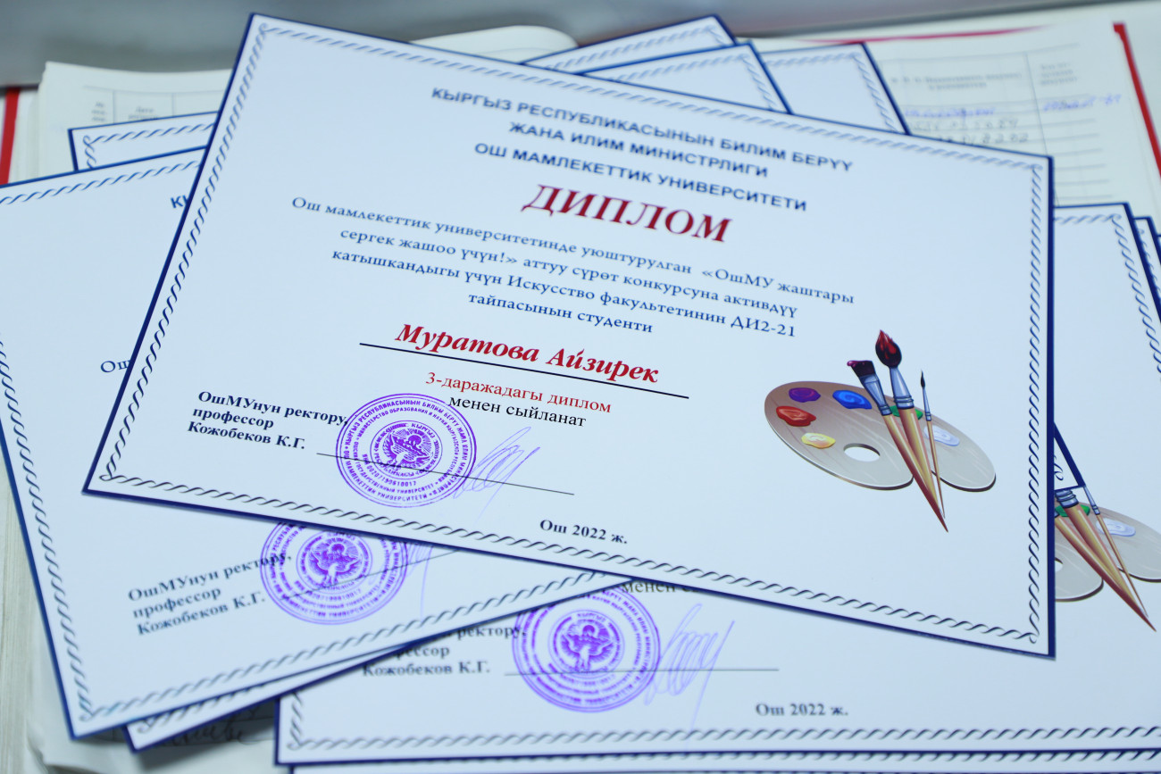 “Байге фонду 30 000 сом болгон сүрөт сынагынын бүгүн жыйынтыгын чыгардык. Жалпысынан 100 дөн ашуун эмгек келип түшкөн. Биз жаштардын кайдыгер карабай активдүү катышып бергендигине кубандык. Эми бул эмгектер ОшМУнун бардык факультет, колледждеринде, жатаканаларында көчмө көргөзмөдө коюлат. Максатыбыз жаштар арасында терс көрүнүштөрдүн алдын алуу, дени сак болууга, спортко үндөө болуп саналат. Бул сынактан сырткары бир ай аралыгында спорттук, маданий, маалыматтык иш-чаралар да өтүп жатат”,-деди студенттик коомчулук менен иштөө боюнча проректор Жылдыз Артыкова.