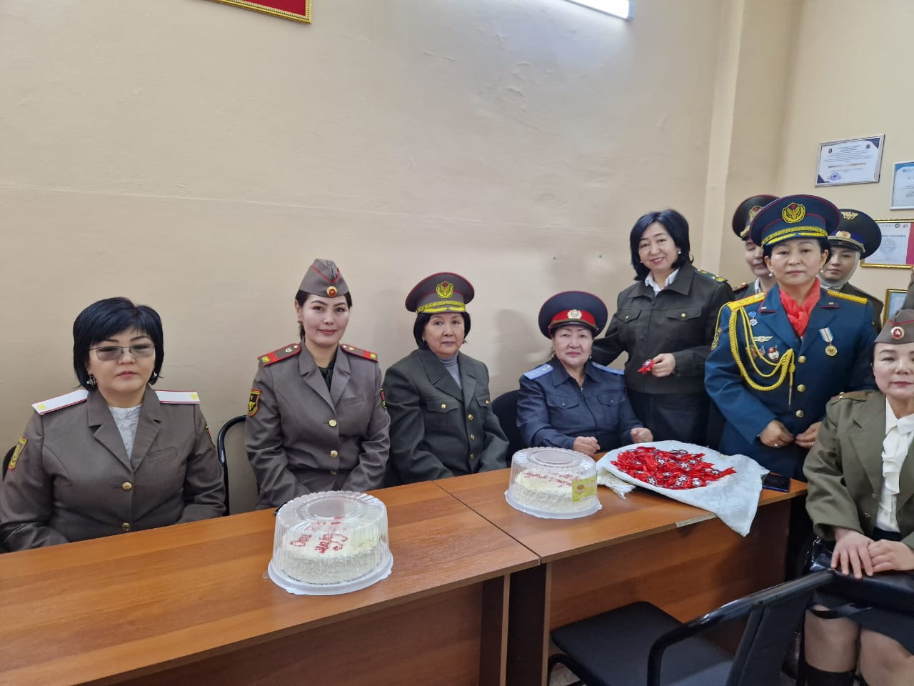 Аялдар кеңешинин жалпы курамы майрамга карата университетте эмгектенген ректорат жамаатын, ошондой эле бардык факультет, колледждерде эмгектенген агайларды, студент мырзаларды  жеринен куттуктап, майрамдык төш белги тагып, шириндиктерди белек кылышты.