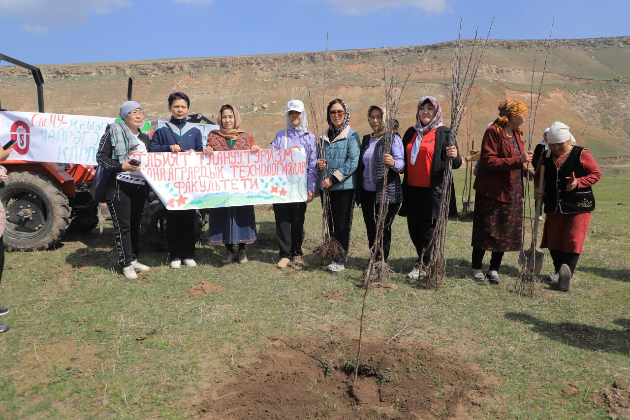 ОшМУнун ректору Кудайберди Кожобеков баштаган жамаат жана окуу жайдын Табият таануу, туризм жана агрардык технологиялар факультетинин, Эл аралык Өзгөн медициналык колледжинин окутуучулары жана студенттери Өзгөн районунун Жалпак-Таш айыл аймагындагы жер көчкү жүргөн жердеги жайытты калыбына келтирүү иш-чарасына катышты.